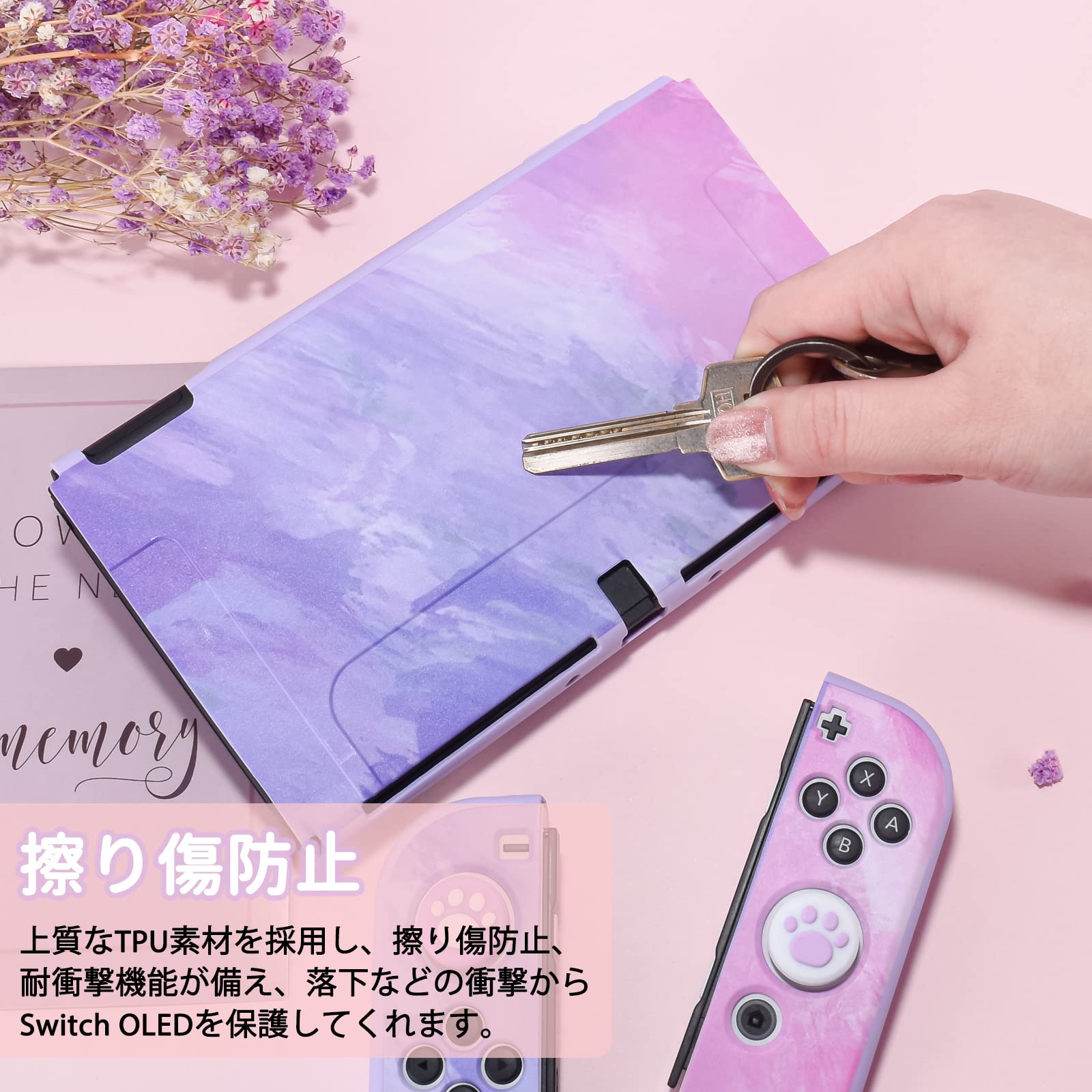 【Switch OLEDに対応】switch OLED のために専門設計された実用TPUカバーです。ミリ単位による精密設計により余計な空間やズレ等はありません。装着後本体と完璧フィットて、ゲームのボタンに邪魔しません。switch OLED各機能が自由に使えます。セット内容:switch OLED保護ケース*1+ガラスフィルム*1+可愛い猫爪親指キャップ*4
