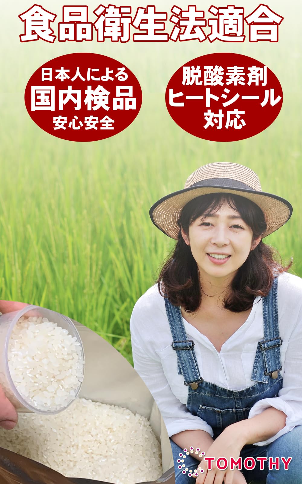 PET、アルミ、PEの三層構造で光、空気、臭いを遮断してお米の劣化を防ぎ、鮮度保持に力を発揮。 白米を美味しく保存できる「TOMOTHYお米保存袋」。 お米を入れて中の空気をできるだけ追い出してからチャック(ジッパー)をきっちり閉めて保管してください。 【お米の保存方法】密閉して涼しい場所、できれば冷蔵庫(野菜室)など涼しい場所で保管するのがおすすめです。 また、直射日光や湿気、水濡れを避けることでカビや虫の発生を避けることができます。 【保存容器はいつも清潔に】お米は臭いが移りやすいので古いお米を残したままの状態で新しいお米を足していくのは良くありません。「お米保存袋」は丸洗いできますのでいつでも清潔を保てます。(ご注意・・・食器洗い乾燥機はご利用できません。) 【ヒートシーラーで長期保存できます】市販の脱酸素剤を封入後、チャック上の部分をヒートシーラーで密封することで酸化を防ぎ、長期間美味しく保存できます。