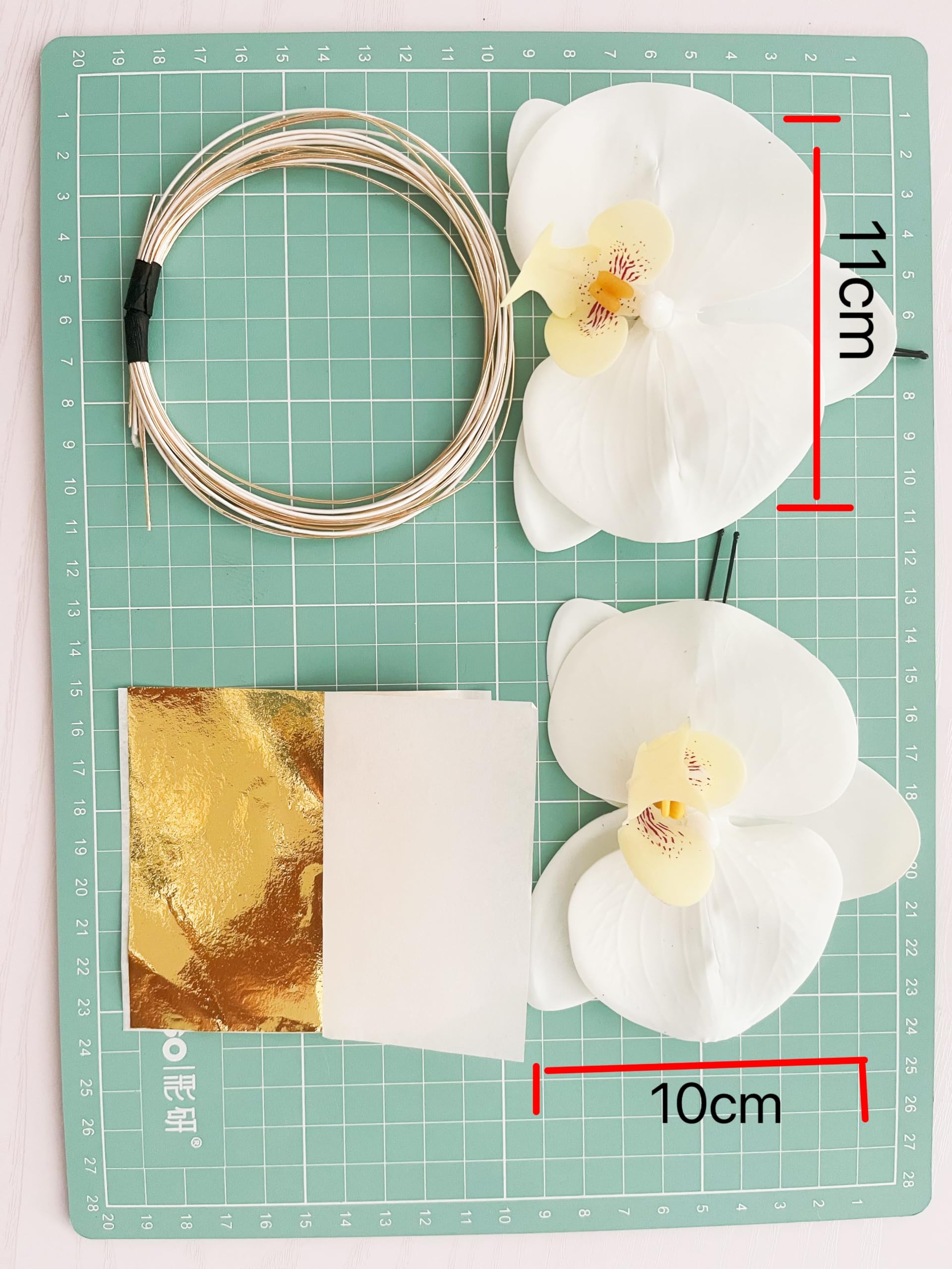 ■素材: ●ホワイト胡蝶蘭×2 縦横さ10-11㎝ ●水引き(90cm)ゴールド×3 ホワイト×2 ●金箔((イミテーション)) ×2