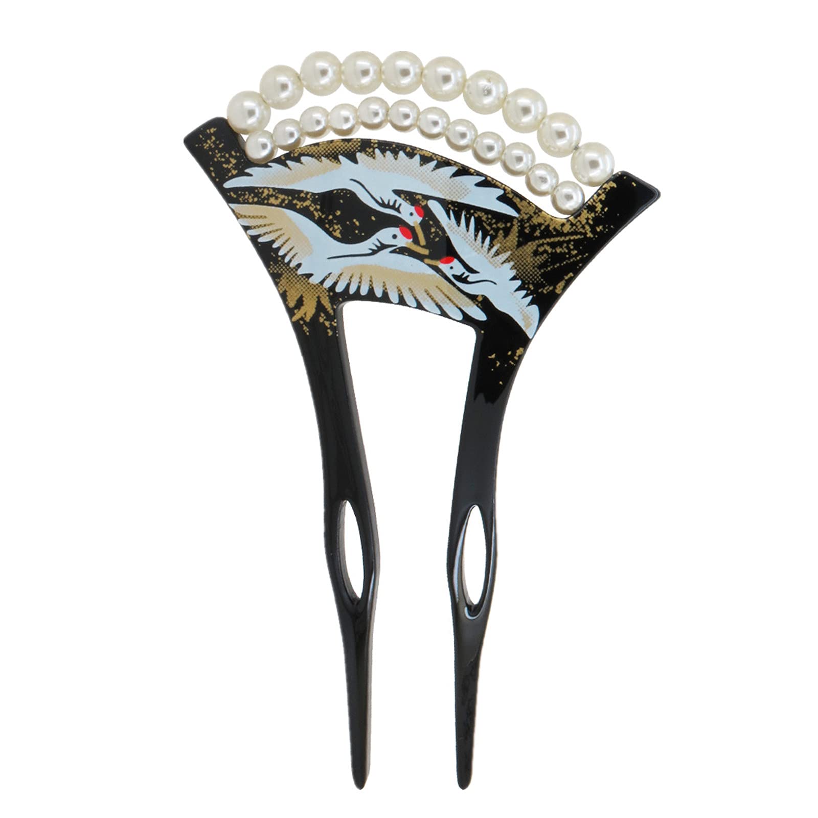 鶴の柄とパールがあしらわれたU型かんざしです。派手すぎず地味すぎず、上品でエレガントな雰囲気を演出してくれます。