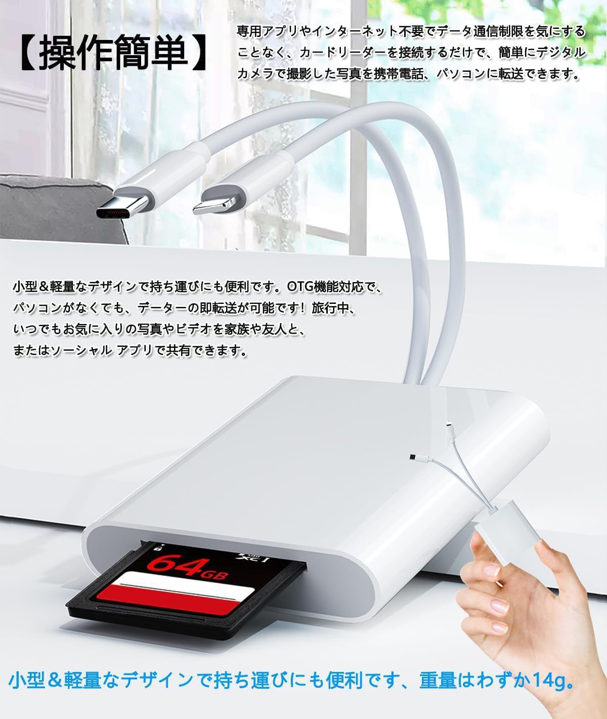 【操作簡単】専用アプリやインターネット不要でデータ通信制限を気にすることなく、カードリーダーを接続するだけで、簡単にデジタルカメラで撮影した写真を携帯電話、パソコンに転送できます。小さいなサイズで軽く、ケーブルも短く、携帯しやすい。小型&軽量なデザインで持ち運びにも便利です。OTG機能対応で、パソコンがなくても、データーの即転送が可能です!旅行中、いつでもお気に入りの写真やビデオを家族や友人と、またはソーシャル アプリで共有できます。ご出張中、ご旅行中、手軽にカバンに入れて楽々です、写真愛好家に最適です。