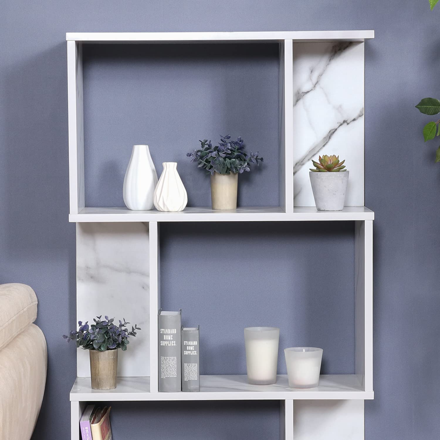 大理石調のモダンなデザインが目を引くS字型のオープンラック。