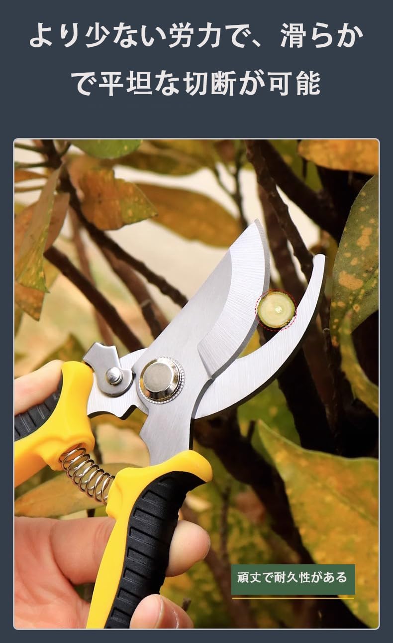 この万能剪定鋏は、高品質のステンレス鋼を使用しており、耐食性と硬度が高く、長期的な使用においても優れた効果を発揮します。人間工学に基づいたデザインで、快適な握り心地とフレキシブルな操作性で、作業効率を向上させます。鋭利な刃先は、様々な材料を素早く切断でき、作業効率を高めます。滑り止め付きのハンドルで、作業中に手が滑るのを効果的に防止し、ユーザーの安全を確保します。園芸作業はもちろん、家庭装飾や布地加工など、様々な環境に対応しています。この剪定鋏は、芝刈りハサミ、観葉植物の剪定、根切り、花鋏、水草ハサミ、枝切り鋏など、様々な用途において最適な選択肢です。接ぎ木ナイフ 剪定バサミ 、剪定ハサミ、剪定バサミ 日本製、剪定鋏、枝切りハサミ、剪定ばさみ、枝切りバサミ、園芸はさみ、園芸ハサミ、園芸用品、たかえだきりはさみ 人気ランキング、園芸、枝切りはさみ 太い枝、花 ハサミ、花切りハサミ、花切りはさみ 生花 、根切り、接ぎ木ハサミ、盆栽、はさみ 切れ味抜群