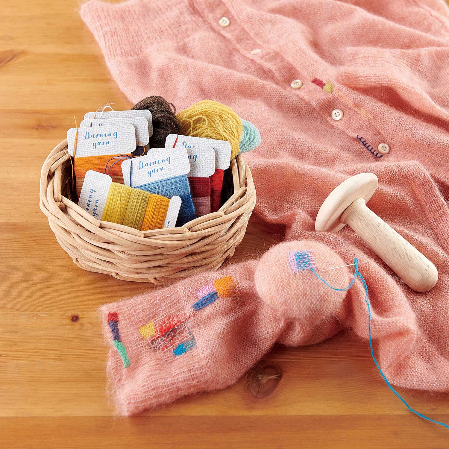 穴のあいた靴下や衣類を簡単にお直しできるダーニング糸。別売りのダーニングマッシュルームが必要です。