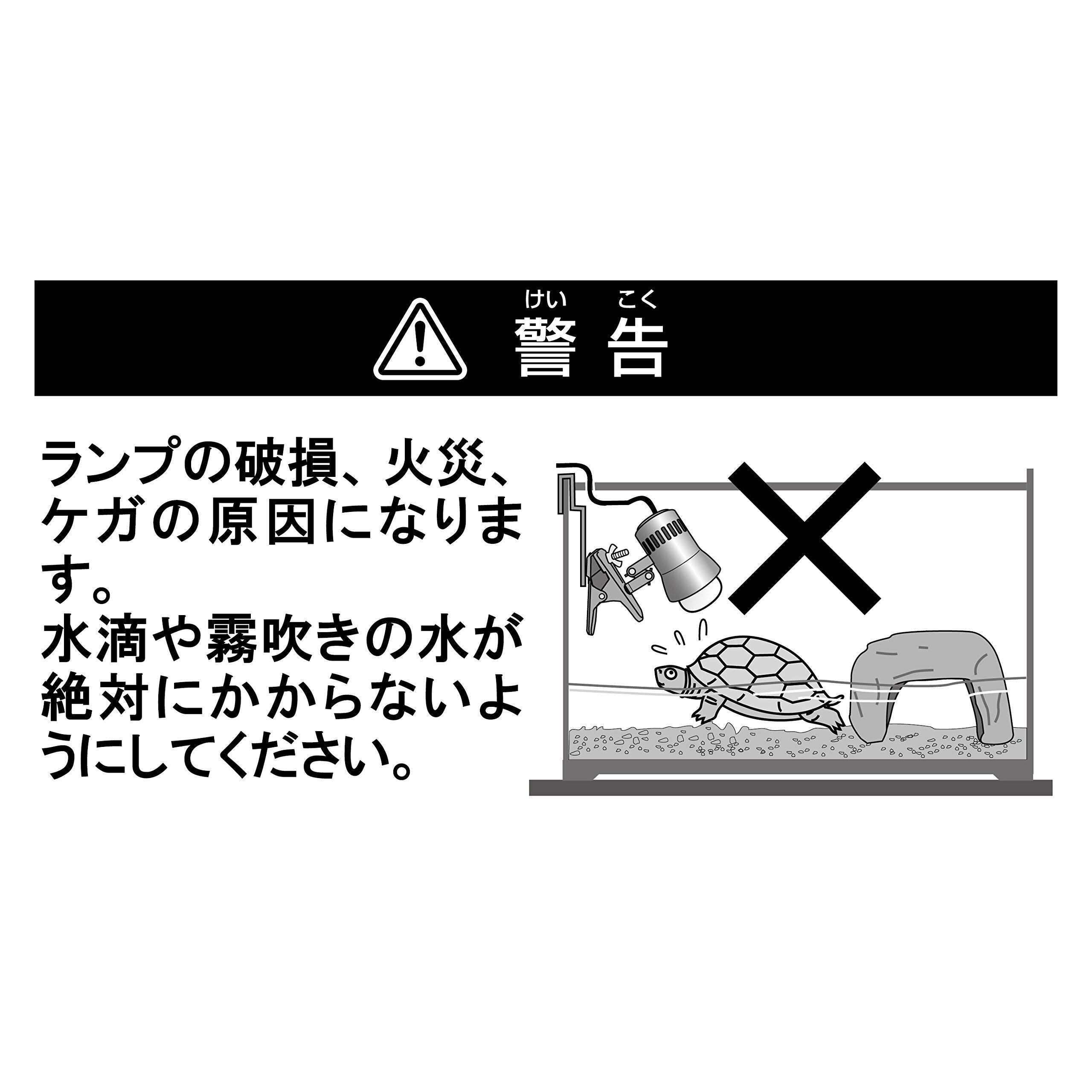 ※本製品は屋内爬虫類飼育専用です。他の目的には使用しないでください。※必ず爬虫類専用の点灯器具を使用してください。※物でおおったり、燃えやすいものに近づけないでください。※取り付け、取り外しや掃除の際は、必ず器具の電源を切り、差し込みプラグを抜いてください。※生体やディスプレイ、飼育ケージ(プラスチックフレーム、ガラス)などに直接触れないように設置してください。ヤケドや変形、火災の原因になります。※必ずランプの口金(E26)に適合した器具を使用してください。※水滴がかかる状態では使用しないでください。破損の原因になります。※水滴や霧吹きの水が絶対にかからないようにしてください。※ランプを併用するときは、ランプ同士を離して設置してください。破損の原因になります。