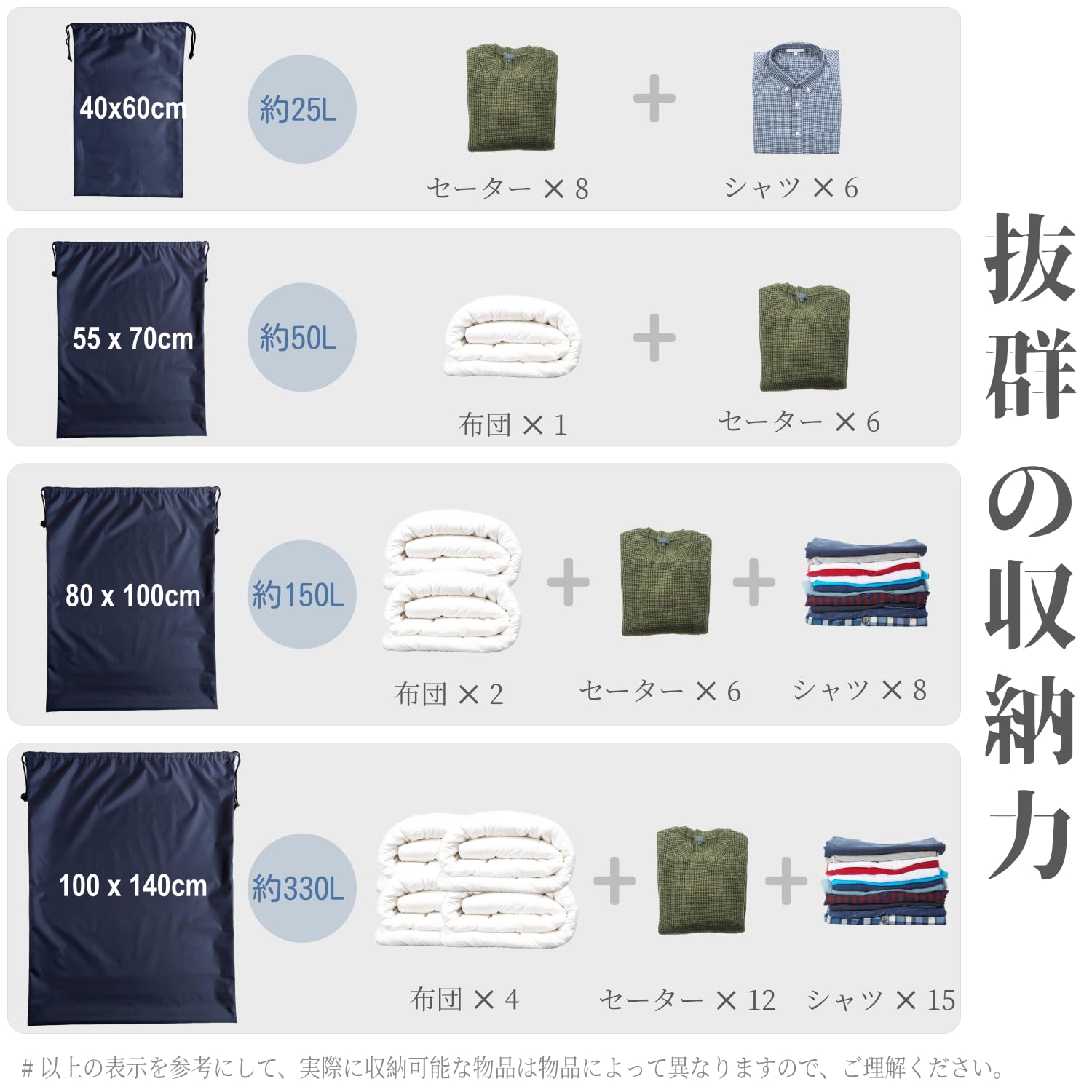 【大サイズ・大容量・耐荷重】本製品は大サイズのロープ袋で、容量が大きく、25L-300Lの物品を収容することができる。大きいサイズなので、たくさんのものや大きな体積のものでも余裕を持って収納できます。収納力抜群。