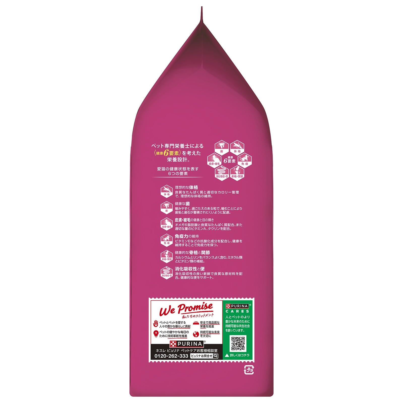 チキン、チキンミール、コーングルテンミール、米、大豆ミール、油脂類(牛脂、大豆油)、フィッシュミール、とうもろこし、家禽ミール、大豆たんぱく、酵母、たんぱく加水分解物、酸味料、 ミネラル類(カルシウム、カリウム、ナトリウム、クロライド、鉄、銅、マンガン、亜鉛、ヨウ素、セレン)、カラメル色素、ビタミン類(A、D、E、B1、B2、パントテン酸、ナイアシン、B6、葉酸、B12、コリン、K、ビオチン、ピロリン酸ナトリウム、アミノ酸類(タウリン、メチオニン)、酸化防止剤(ミックストコフェロール)