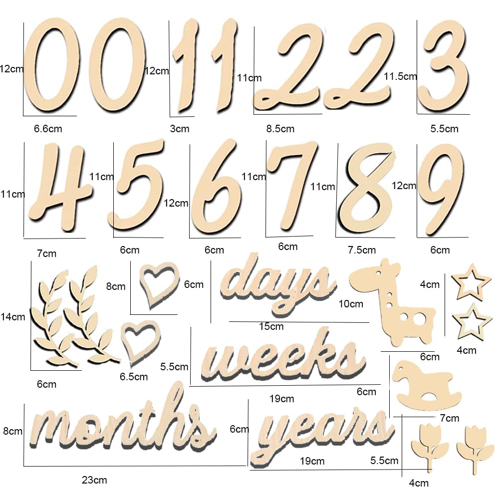 【セット内容】合計29枚セット、0*2枚、1*2枚、2*2枚、3~9各1枚、キリン*1枚、花*2枚、星*2枚、ハート*2枚、馬*1枚、days、weeks、months、years各一枚、合計27枚、サイズ:写真欄にご参照ください。素材:ウッド、厚さ:約3.6mm