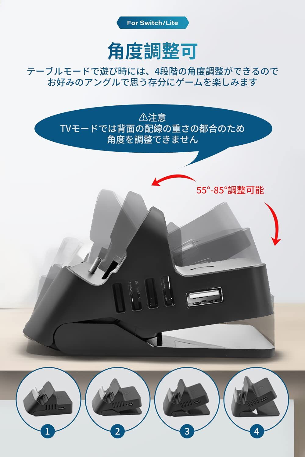 【4段階角度調整可能・画面保護】 テーブルモードで遊ぶ時には、4段階の角度調整ができます。スタンドとしても、角度を変えられるので見やすい角度でプレイできます。注意:TVモードでは背面の配線の重さのため、角度を調整できません。また、オープン式設計より、switch画面を傷つくこともございません。