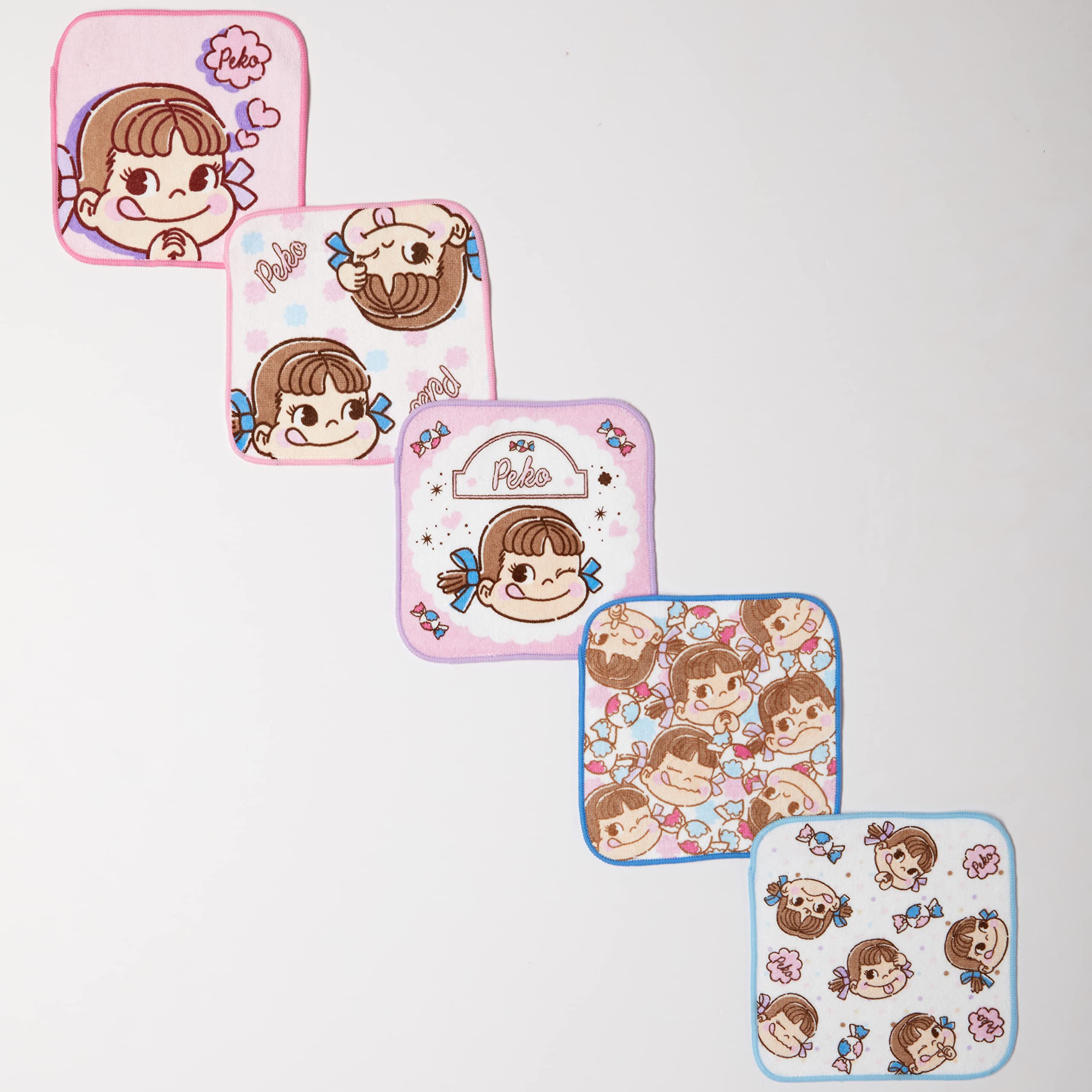 【ペコ&ポコ】不二家のキャラクターお菓子が大好きな女の子のペコちゃんとそのボーイフレンドのポコちゃん。お子様のポケットにも入る小さいサイズのミニタオルです。5枚セットなので日替わりで使用可能です!