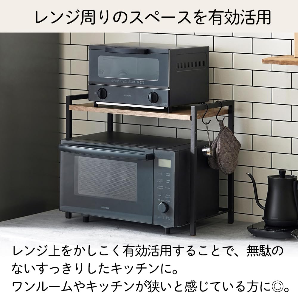 レンジ周りのスペースを有効活用!場所を取らずに収納スペースを確保できるラックです。レンジ上をかしこく有効活用することで、無駄のないすっきりしたキッチンに。木棚板を使用したインテリアに馴染むデザインでワンルームやキッチンが狭いと感じている方にもおすすめ。
