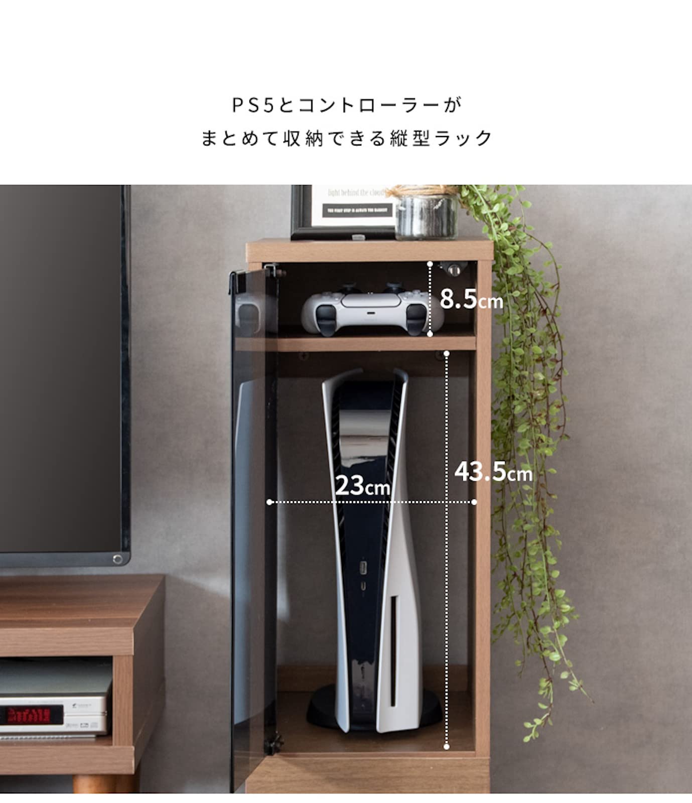 PS5等、縦置き型ゲーム機がスッキリ収納できるラック 邪魔にならない省スペース設計でお部屋に馴染む木目柄のスマートなデザイン