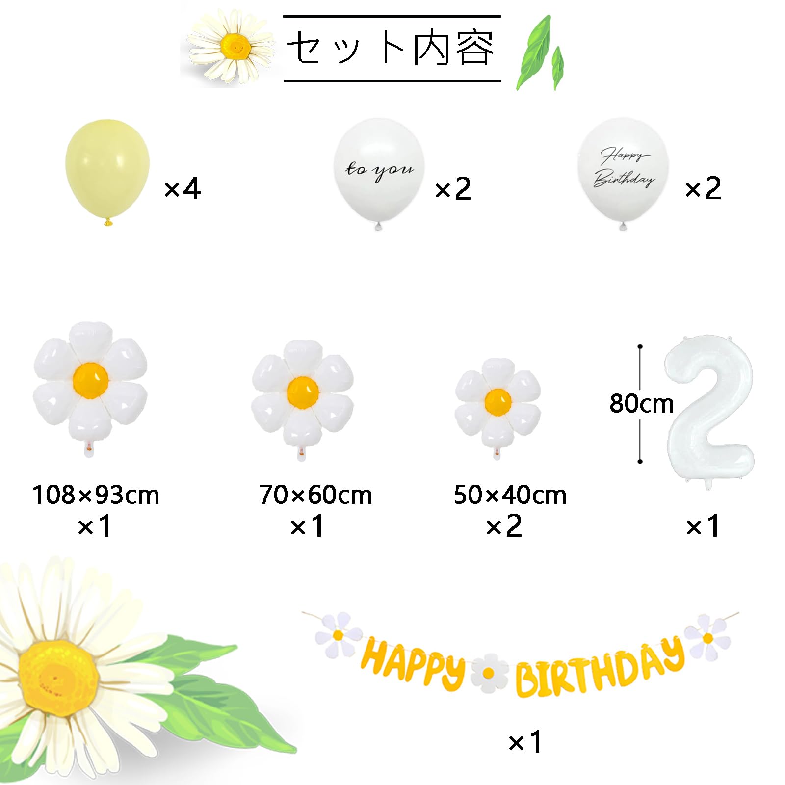 セット内容 - ゴム風船×8(HAPPY BIRTHDAY × 2、TO YOU × 2、うすい黄色× 4)、フェルト布ガーランド×1組、デイジーバルーン ×4、数字バルーン×1、リボンひも (10m)、両面テープ [ゴム風船専用]。