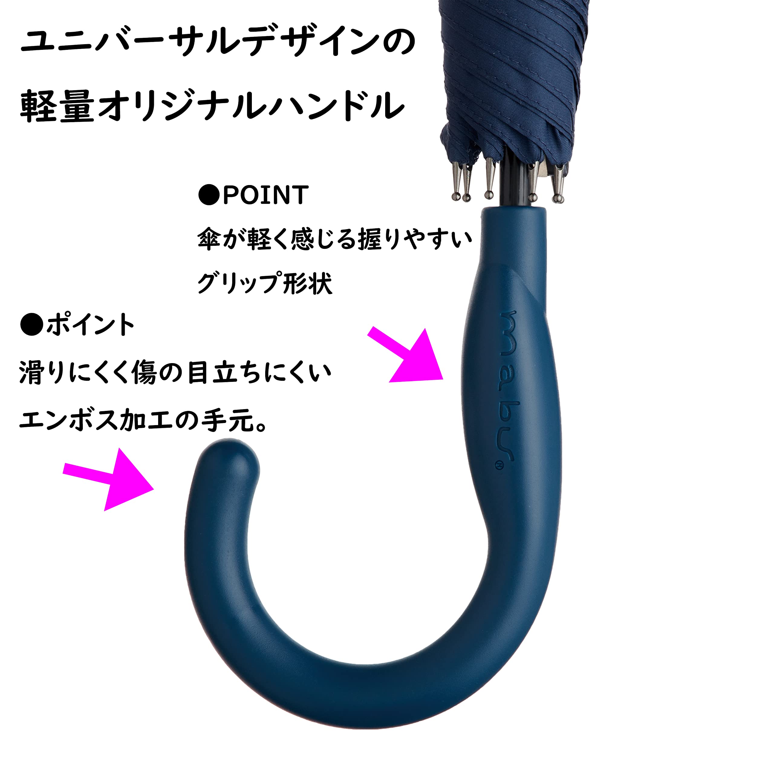 「シンプル&ハイスペックの長傘がアップデート」ワンタッチで簡単オープン、使いやすいサイズ、持ちやすさと握りやすさ。シンプルながらも十分な機能性を工夫した長傘が、環境にやさしいリサイクル生地になりました紫外線遮蔽率90%以上で日傘としても使える、晴雨兼用モデルです。、「mabu」・・・機能×デザイン×LIFE STYLE 。晴れの日も雨の日も楽しく快適に過ごせるレイングッズを企画から生産まで手がける日本の傘メーカー。機能性とデザイン性を兼ね備えた製品は、使いやすい工夫や「あったらいいな」をスマートに搭載。ライフスタイルに寄り添う提案をし続けます。