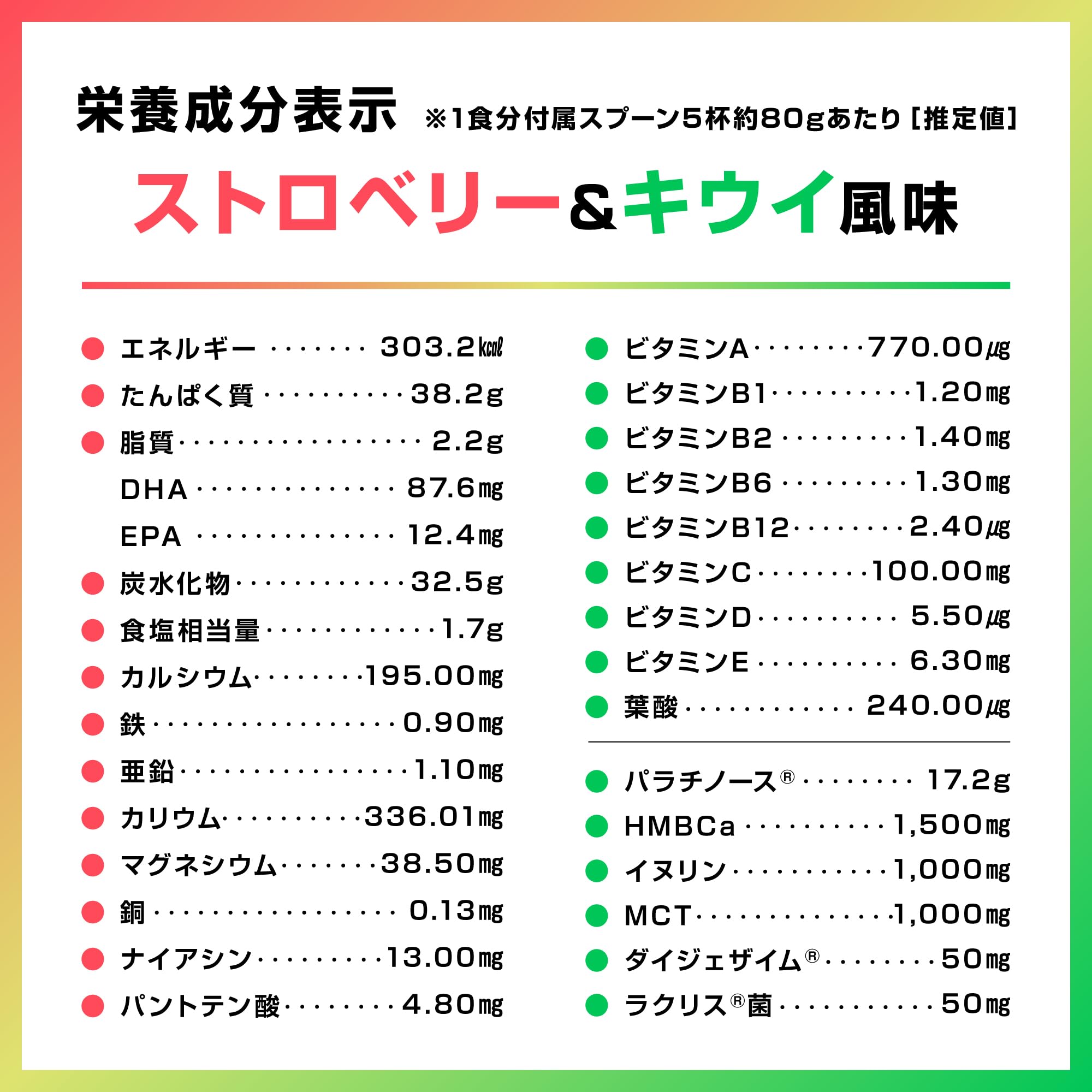 1食分につき付属スプーン5杯(約80g)を目安に300~350mlの水またはお好みの飲料に溶かしてお召し上がりください。