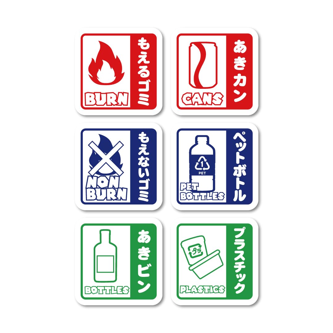 日本製 ゴミ 分別 3色 ステッカー 6枚セット 小 W50mmxH50mm マットラミ ゴミ箱 シール 屋外使用OK 燃えるごみ もえるゴミ 燃えないごみ もえないゴミ プラスチック ペットボトル 缶 ビン [BULKYSTYLE]