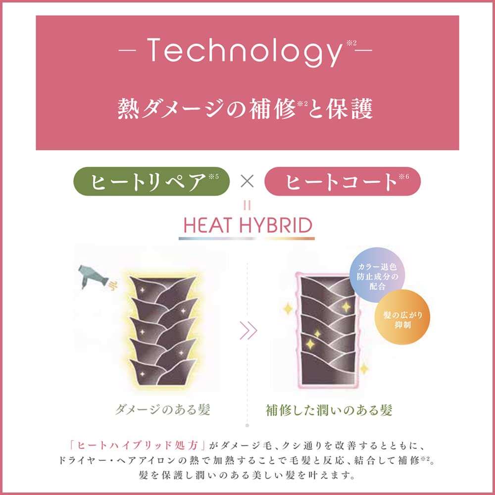 熱を味方に理想の髪に近づける、ヒートリペア成分(熱でダメージに吸着し補修)+ヒートコート成分(熱の力でうるおいを閉じこめる)=ヒートハイブリッド技術