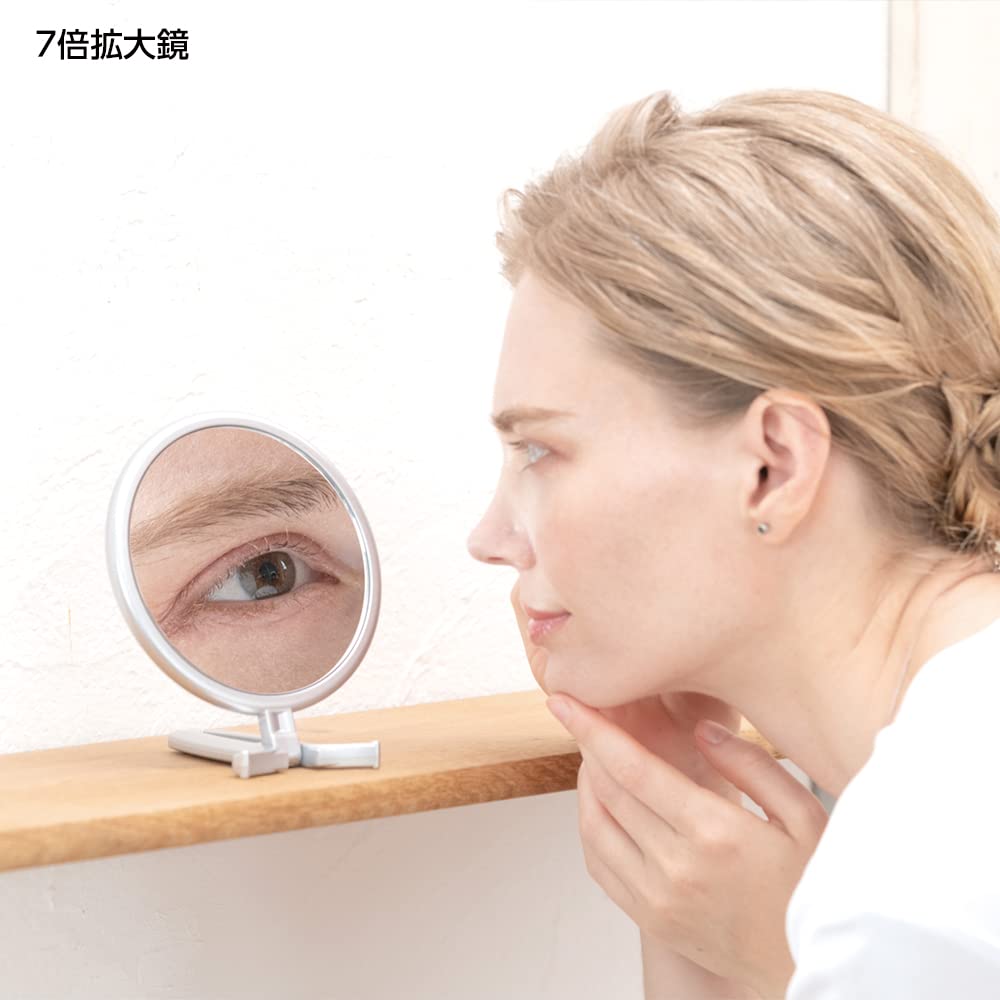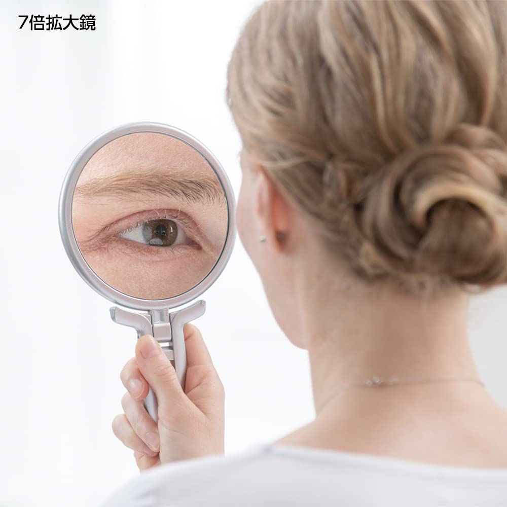 【7倍拡大鏡】等倍鏡と7倍拡大鏡がセットになった両面ハンドミラーです。7倍拡大鏡は細部まで大きく見えて角栓・シミ・シワなどお肌のお手入れに最適です。また、コンタクトレンズの装着の時にも役立ちます。