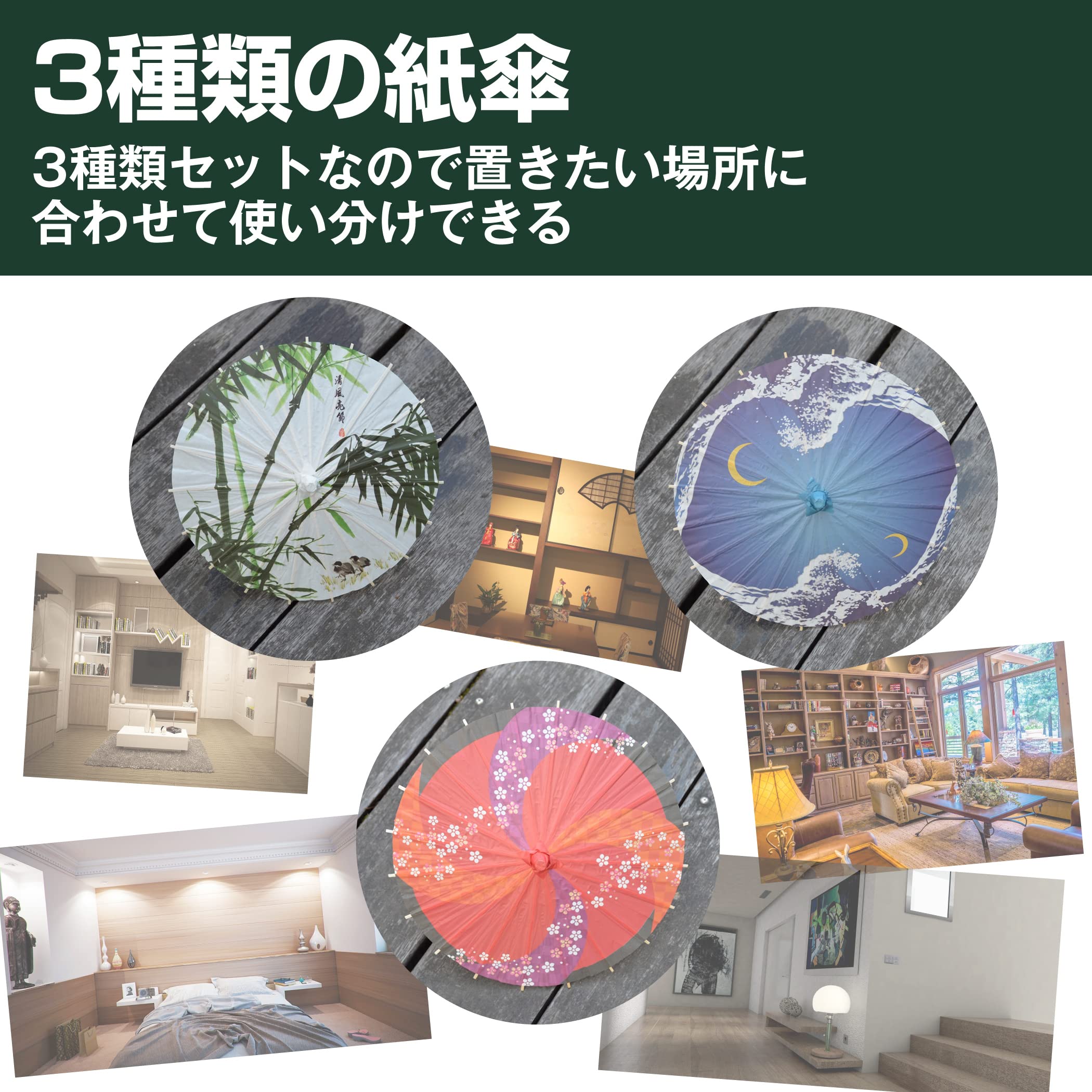 小さくてかわいい:傘の直径が約30cmのとても小さくてかわいらしいサイズ感の紙傘です。飾り棚やテーブルの上などにも置きやすい大きさなので、使いやすくて便利です。3種類の紙傘が揃ったセットなので、置きたい場所に合わせて使い分けもできます。
