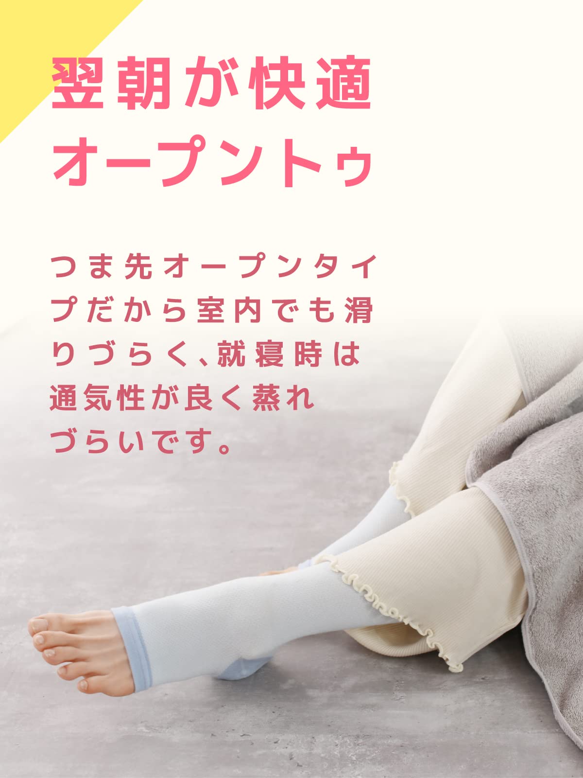 【高い伸縮性だからサイズ選びに悩まない】ひざ下・オープントゥタイプでつま先がないため、夜用にご着用いただけます。シルク混素材を採用しているため、寝る時だけでなく日中にも最適です。