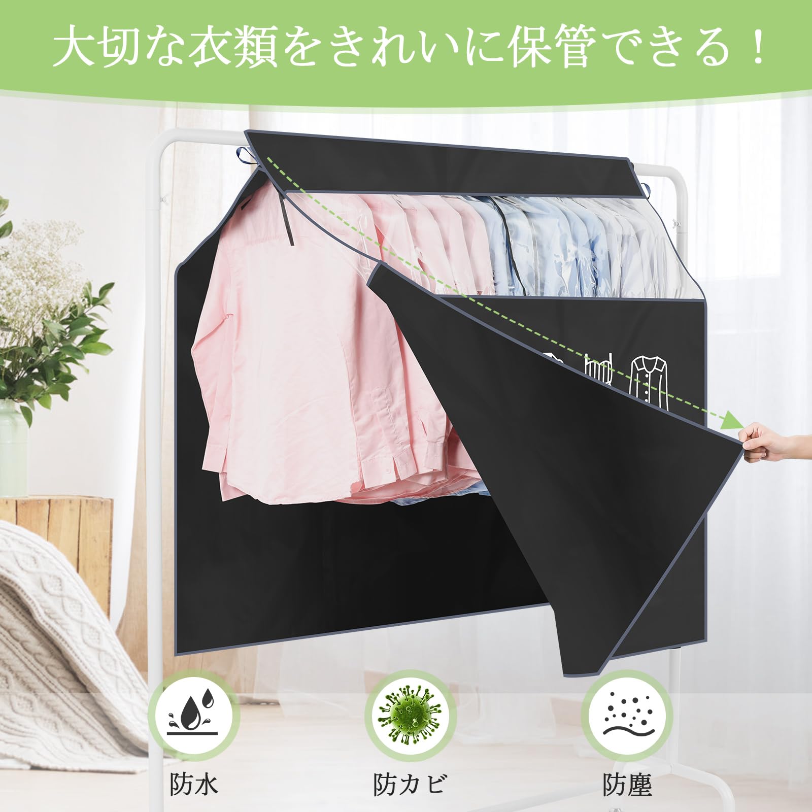 【商品仕様】サイズ:幅110cmx120cm高さ。ハンガーラックをすっかりカバーできるので、ベッドルーム、ベランダ、洋服ラックなど場所には使用できます。