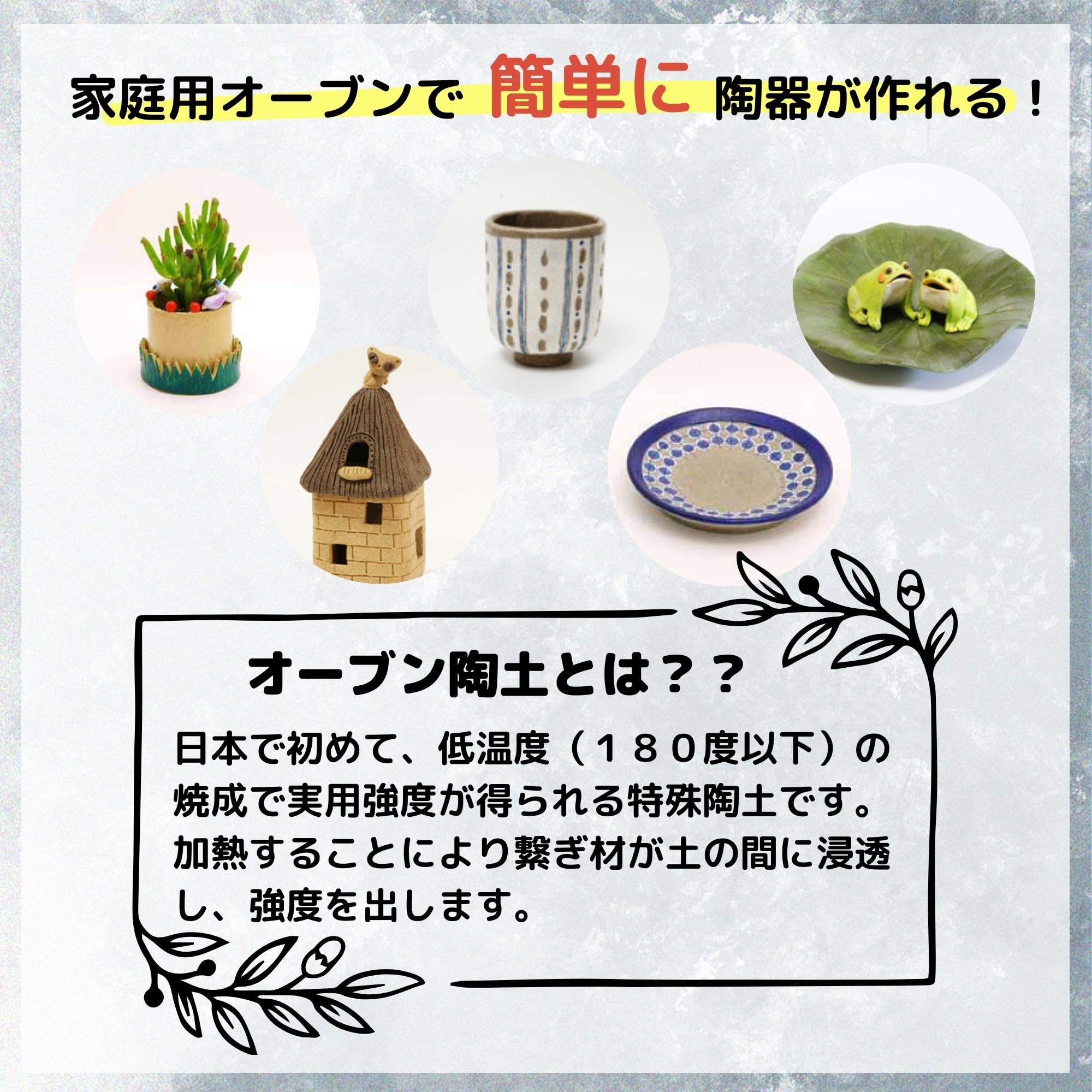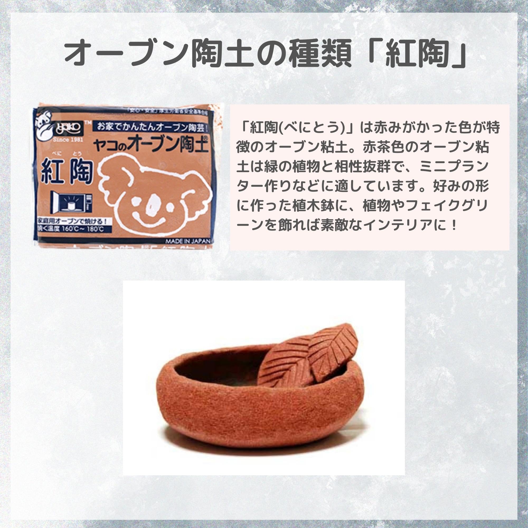 "「紅陶(べにとう)」は赤みがかった色が特徴のオーブン粘土。赤茶色のオーブン粘土は緑の植物と相性抜群で、ミニプランター作りなどに適しています。 「黒木節」は工作用オーブン陶土と性状は同一で、お互いにまぜて使用することができます。瀬戸産の黒木節粘土を使用しているため焼き上がりは濃茶になり、シックな仕上がりの作品が作れます。"