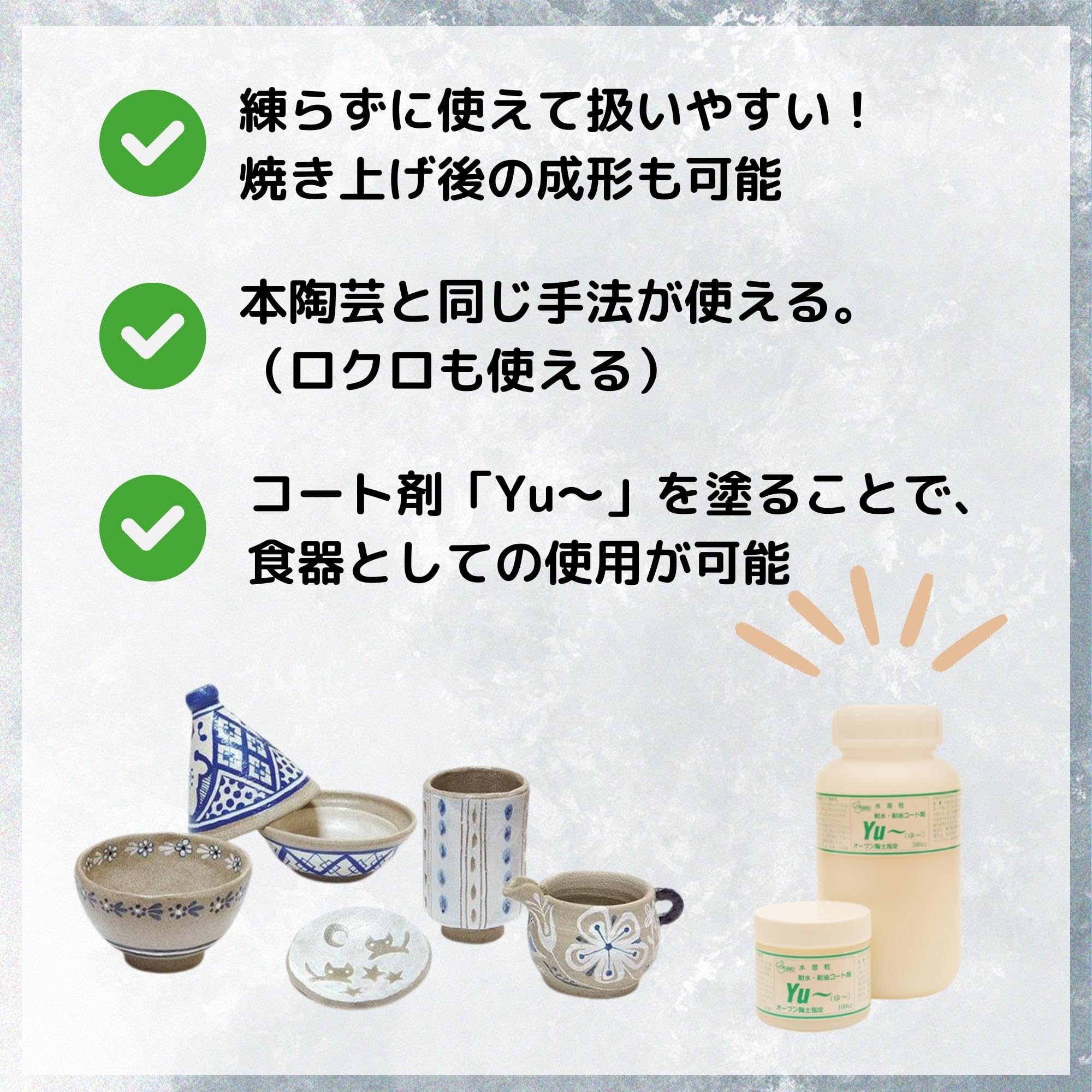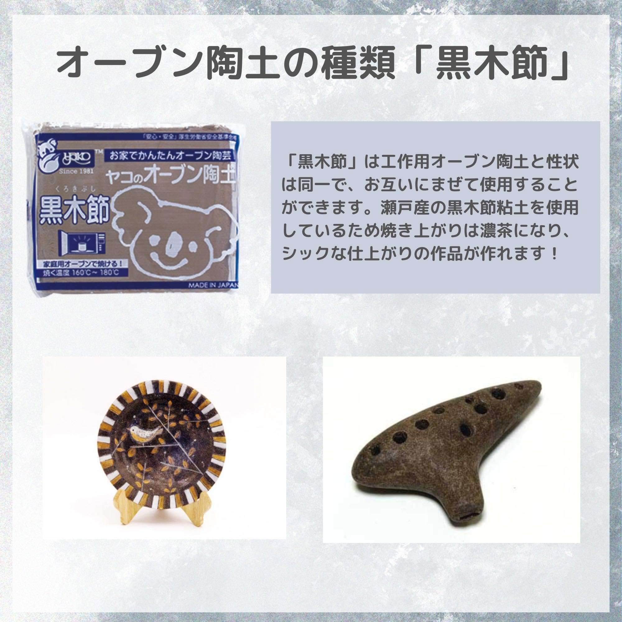 「黒木節」は工作用オーブン陶土と性状は同一で、お互いにまぜて使用することができます。瀬戸産の黒木節粘土を使用しているため焼き上がりは濃茶になり、シックな仕上がりの作品が作れます。