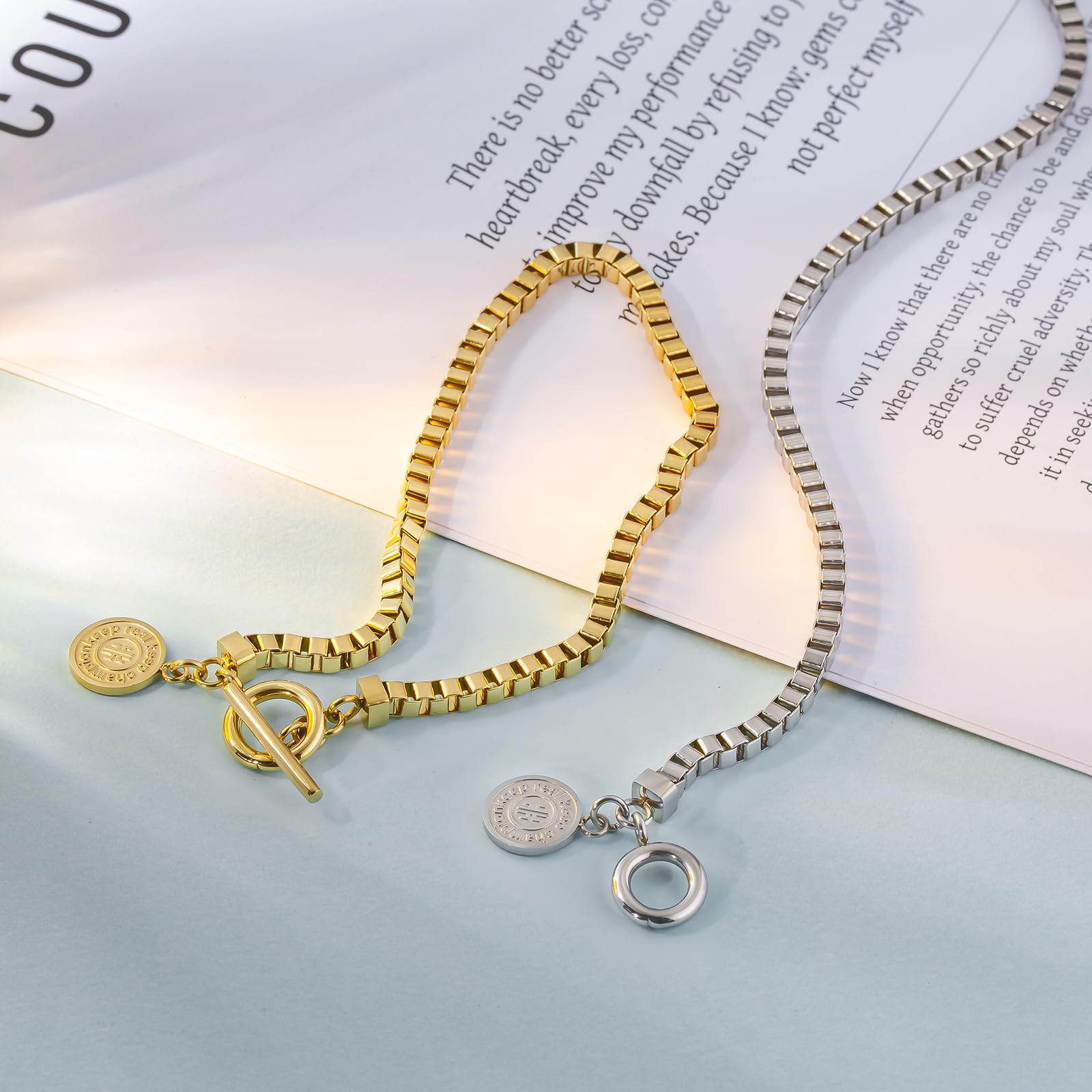 【マンテル式留め具】Tバーとも呼ばれる流行りのマンテル留め具を採用。バーを輪に通すだけで、片手で簡単に着脱可能です。4mmチェーンに合わせ、通常よりもコンパクトな留め具を設計。シンプルながらもしっかりと存在感を感じさせるデザインに仕上がっています。
