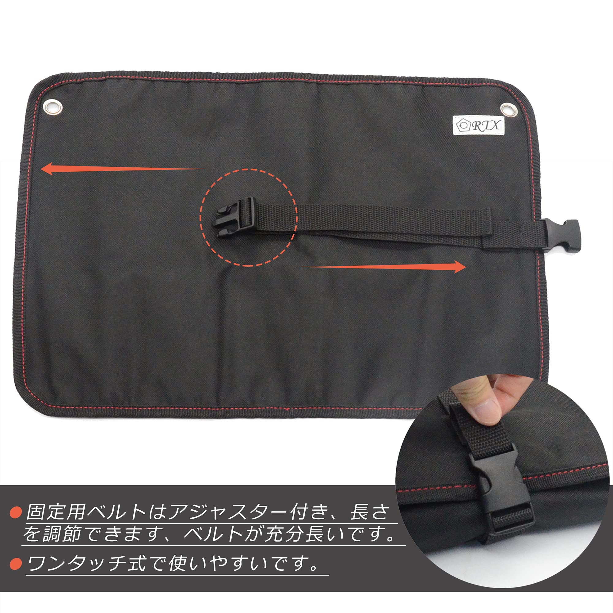 固定用ベルトの長さが調節できます、充分長いですので、ツールロールを全周巻くことができます、ダブル巻くこともできます。ワンタッチ式で使いやすいです。ツールロール上部両端にそれぞれ1ヵ所、金属製のリングで補強された穴があいており、壁に吊るして使うこともできます。工具の落下を防止するカバー付きです。