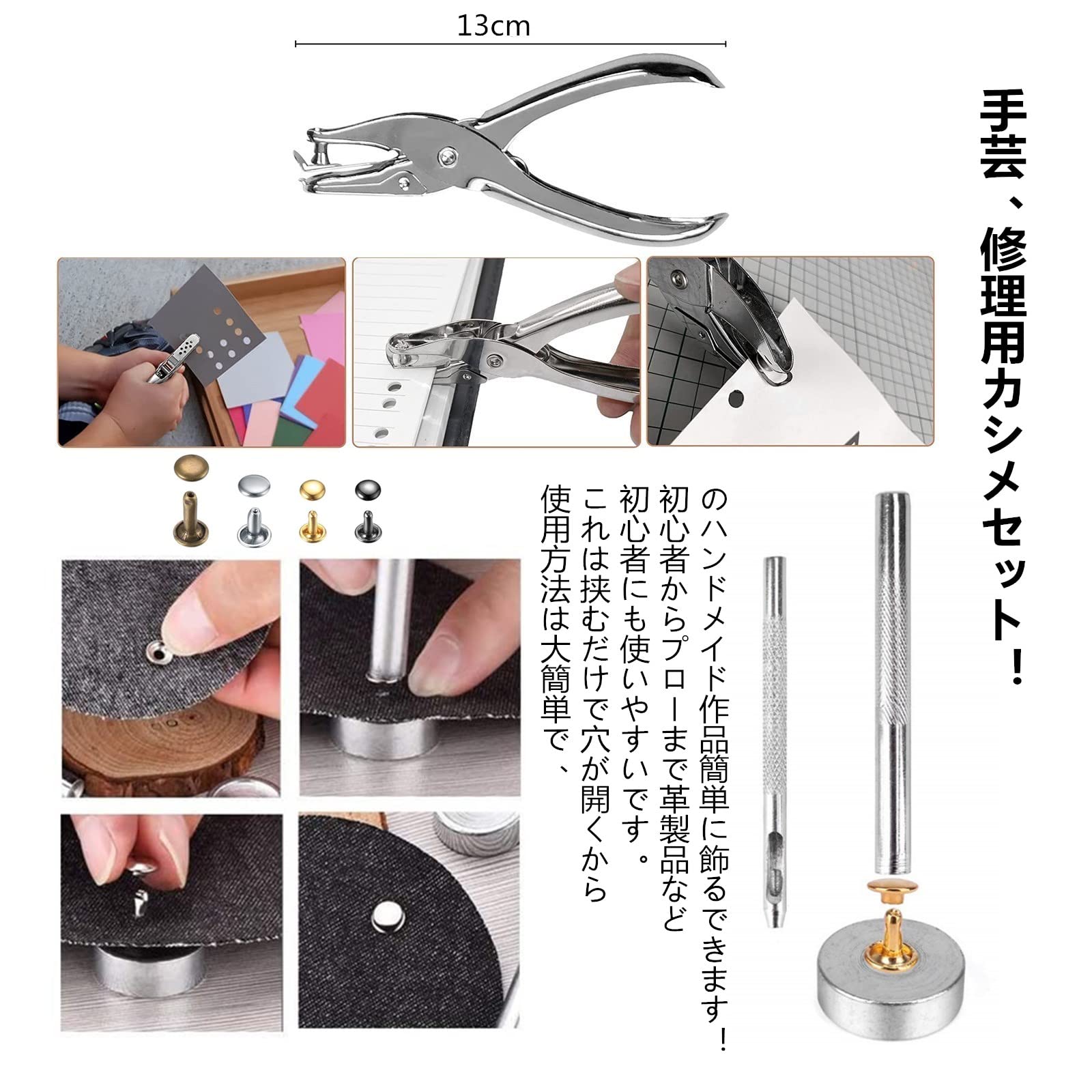 【使いやすい】:このカシメ金具は手芸、修理用スタッズ セットです。手芸用スタッズセットで、6/8/12mmのスタッズを取り付けるのに便利な工具とスタッズのセットです。使用方法は大簡単で、初心者からプローまで革製品などのハンドメイド作品簡単に飾るできます