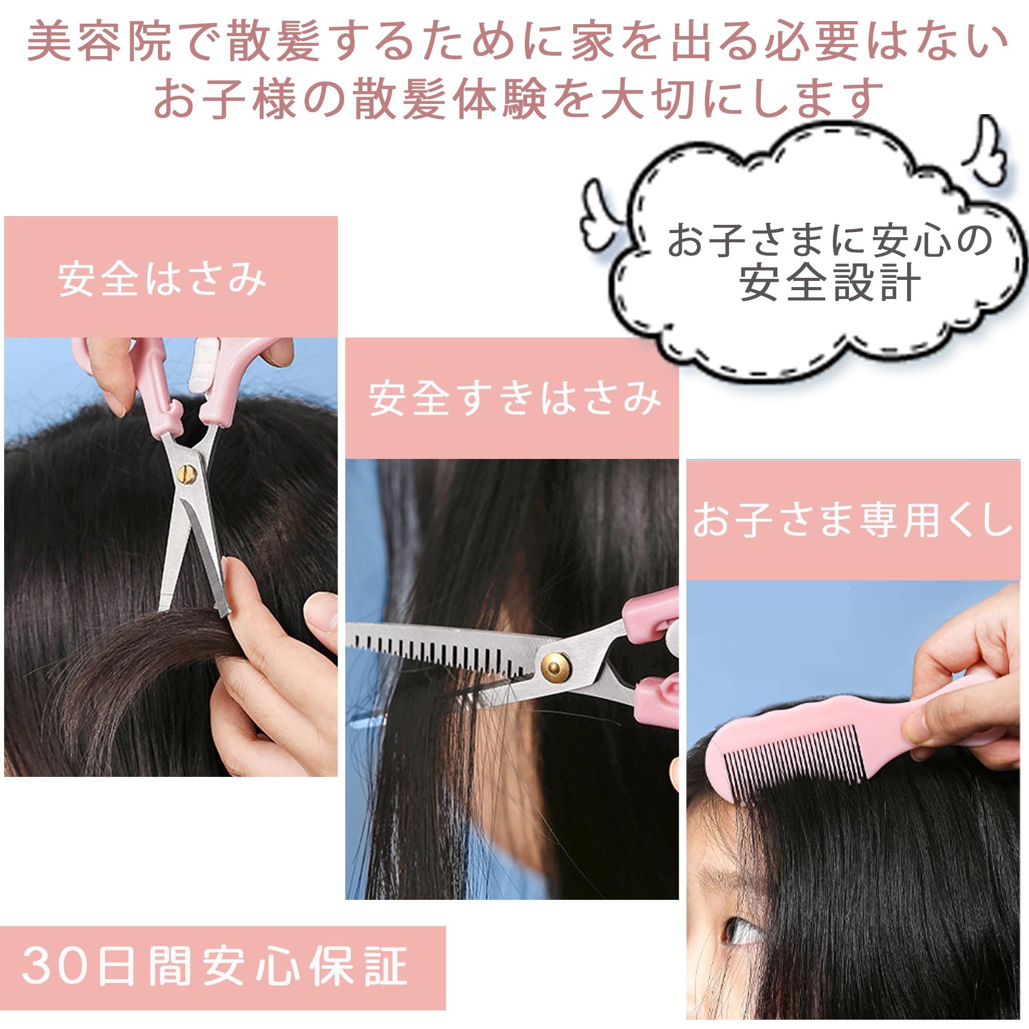 散髪 はさみ 子供 すきばさみ 3本セット セルフカット 安全なロック付き ハサミ フラットシザース ドットコーム 髪切りはさみ クッションくし 家庭用 赤ちゃん ベビー用 収納ボックス付属 (ピンク)