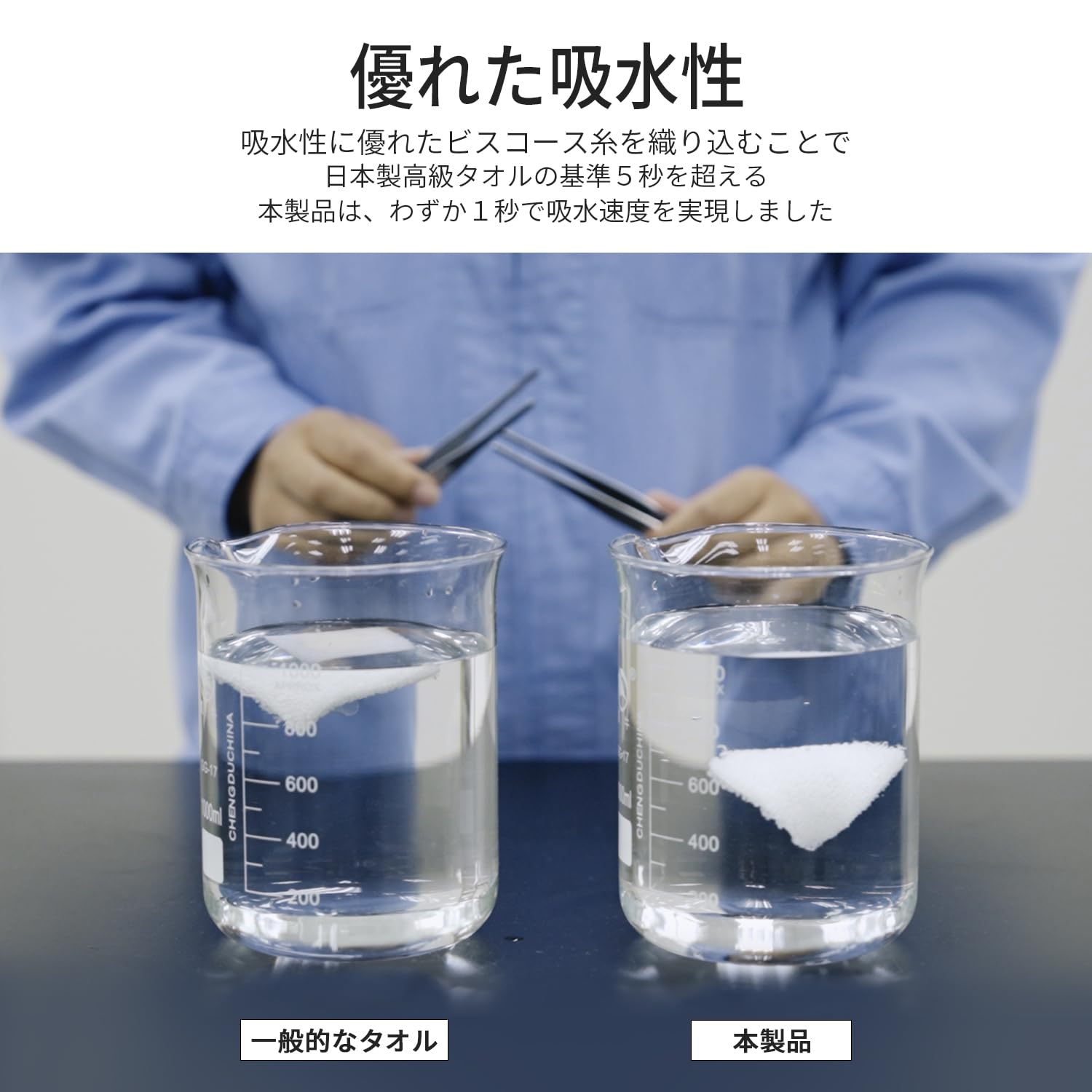 【驚くほどの吸水力と速乾性】わずか1秒で吸水!AIFYのフェイスタオルは繊維の隙間がより細かく。水に触れた瞬間、スッと吸い込むような驚異の吸水力。高密度パイル構造が水分をしっかりキャッチし、肌や髪を優しく包み込むように乾かします。軽量で厚手なのに速乾性にも優れ、部屋干しでも嫌なニオイがつきにくく、毎日の使用に最適です。