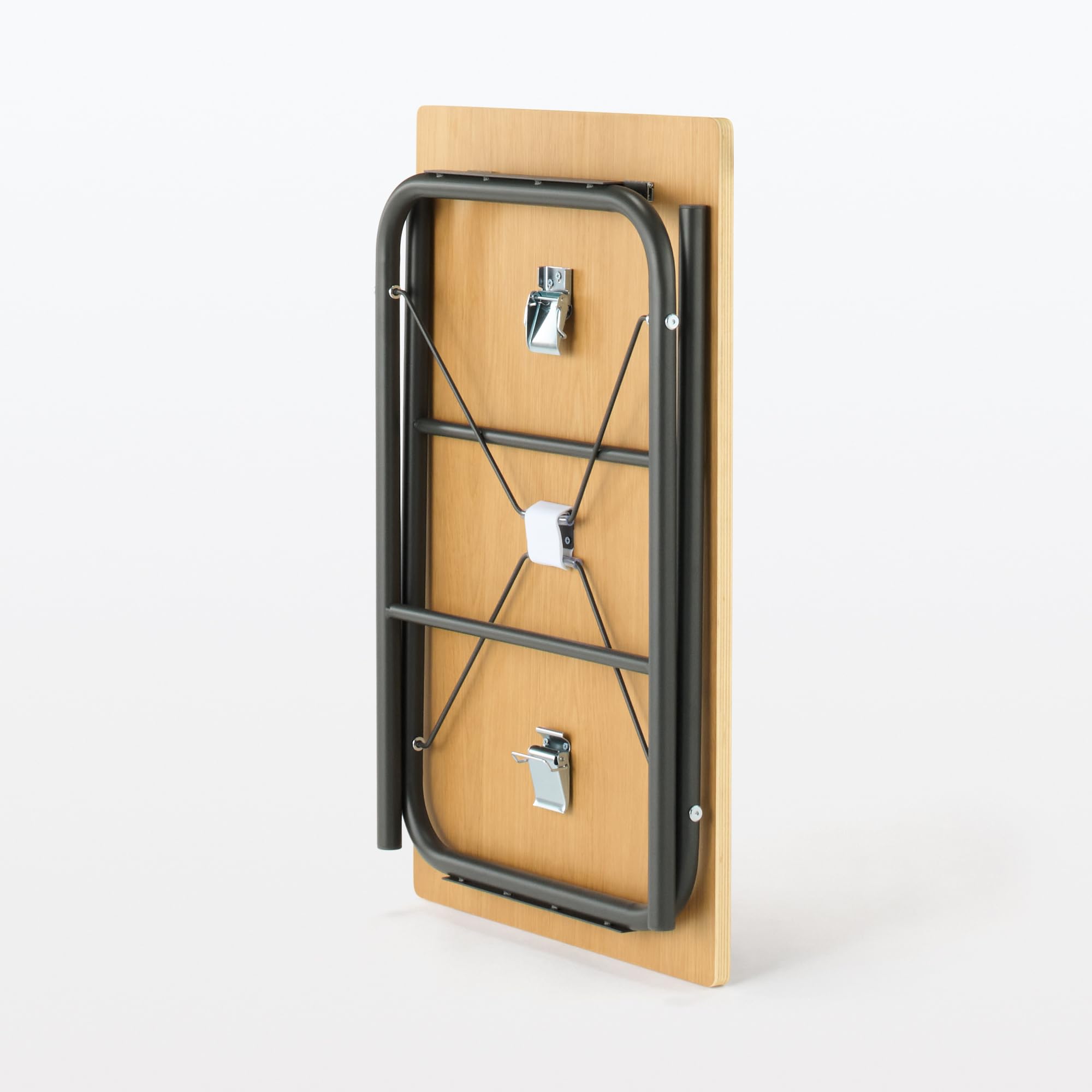 曲げたスチールパイプに板を取り付けたシンプルなテーブルです。使わないときはたたむことで、省スペースで保管ができます。