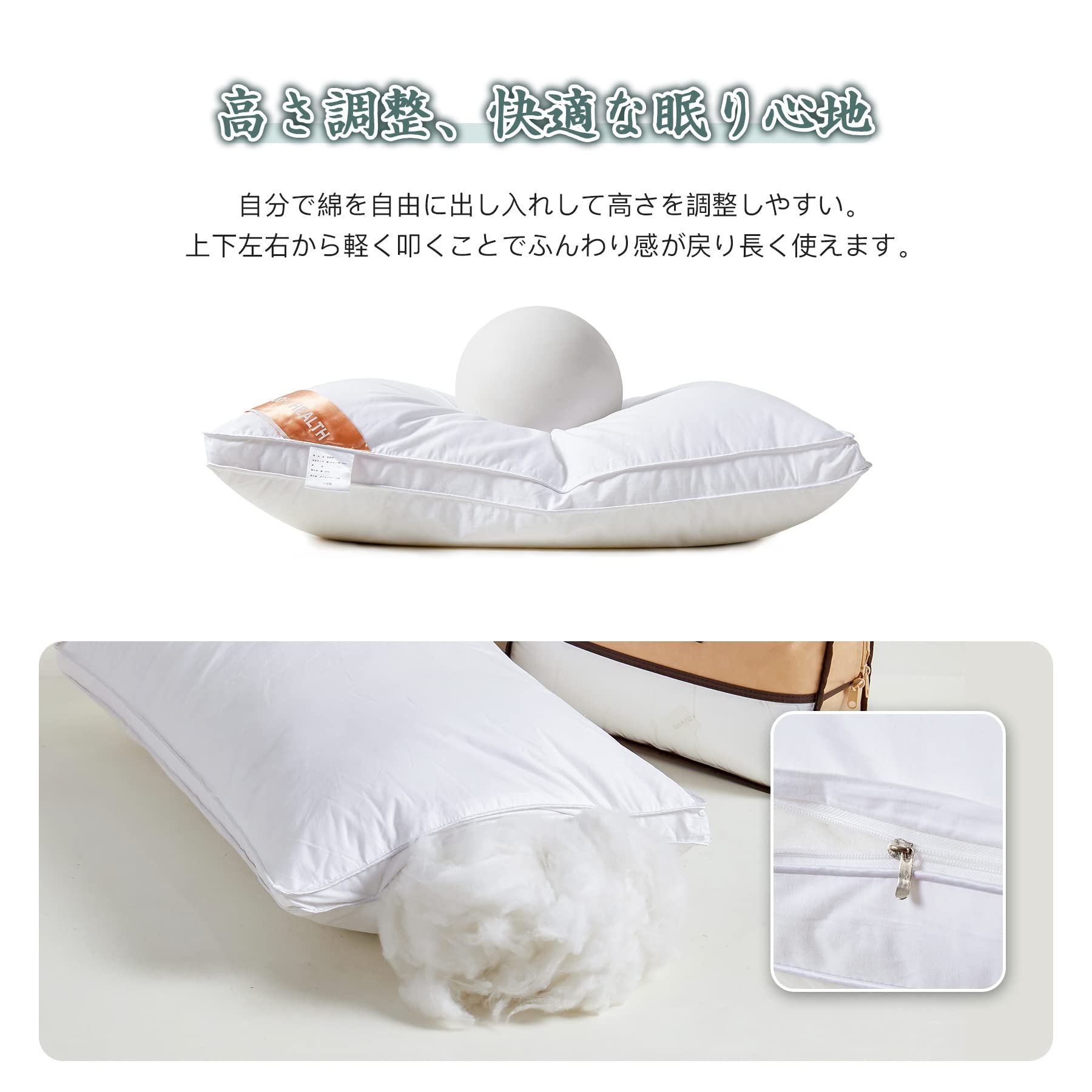 【高さ調整】低めの枕がお好みの方は、ファスナーを開けてから、綿の出し入れでお好みの高さでできますように 調整することがますす。