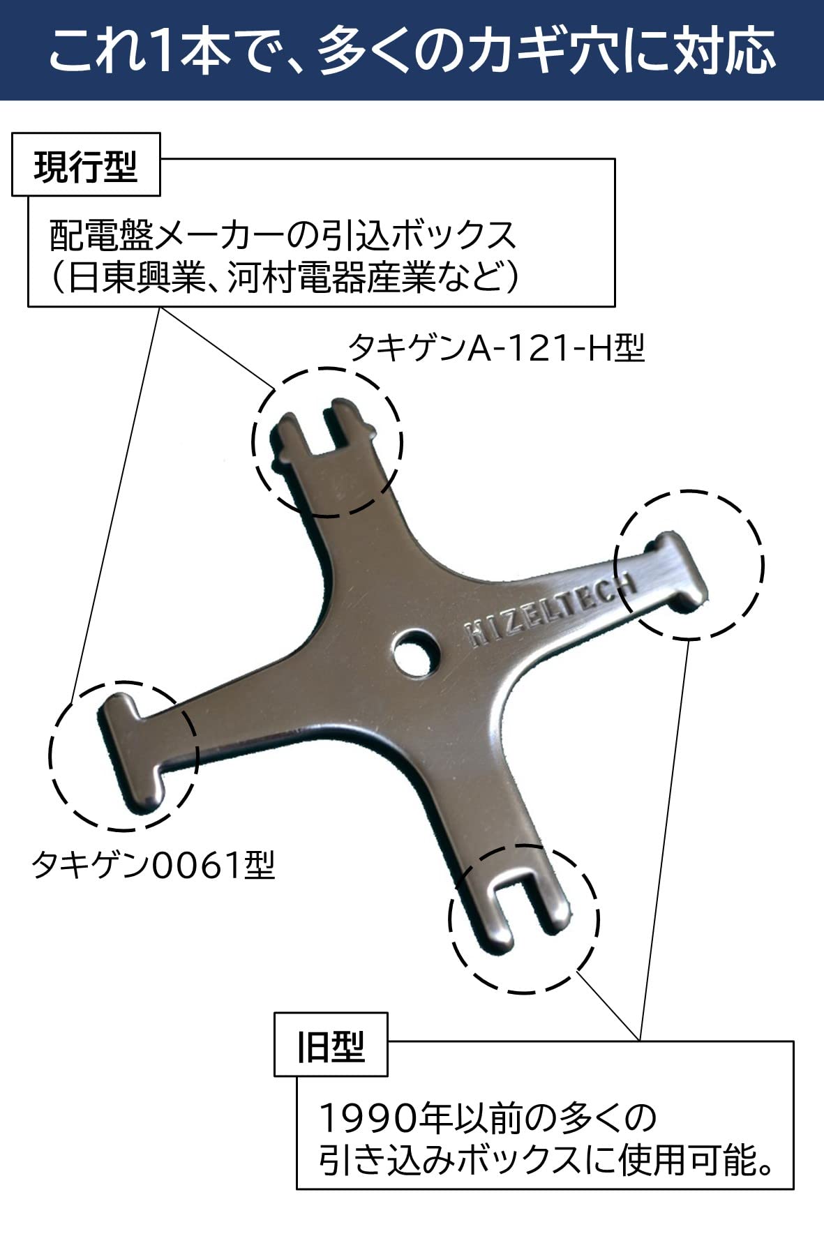 機能:1台4役、1つで4タイプの鍵穴に対応 ①タキゲン 0061型、②タキゲン A-121-H型、③④1990年以前の引き込みボックスの多くに使用可能