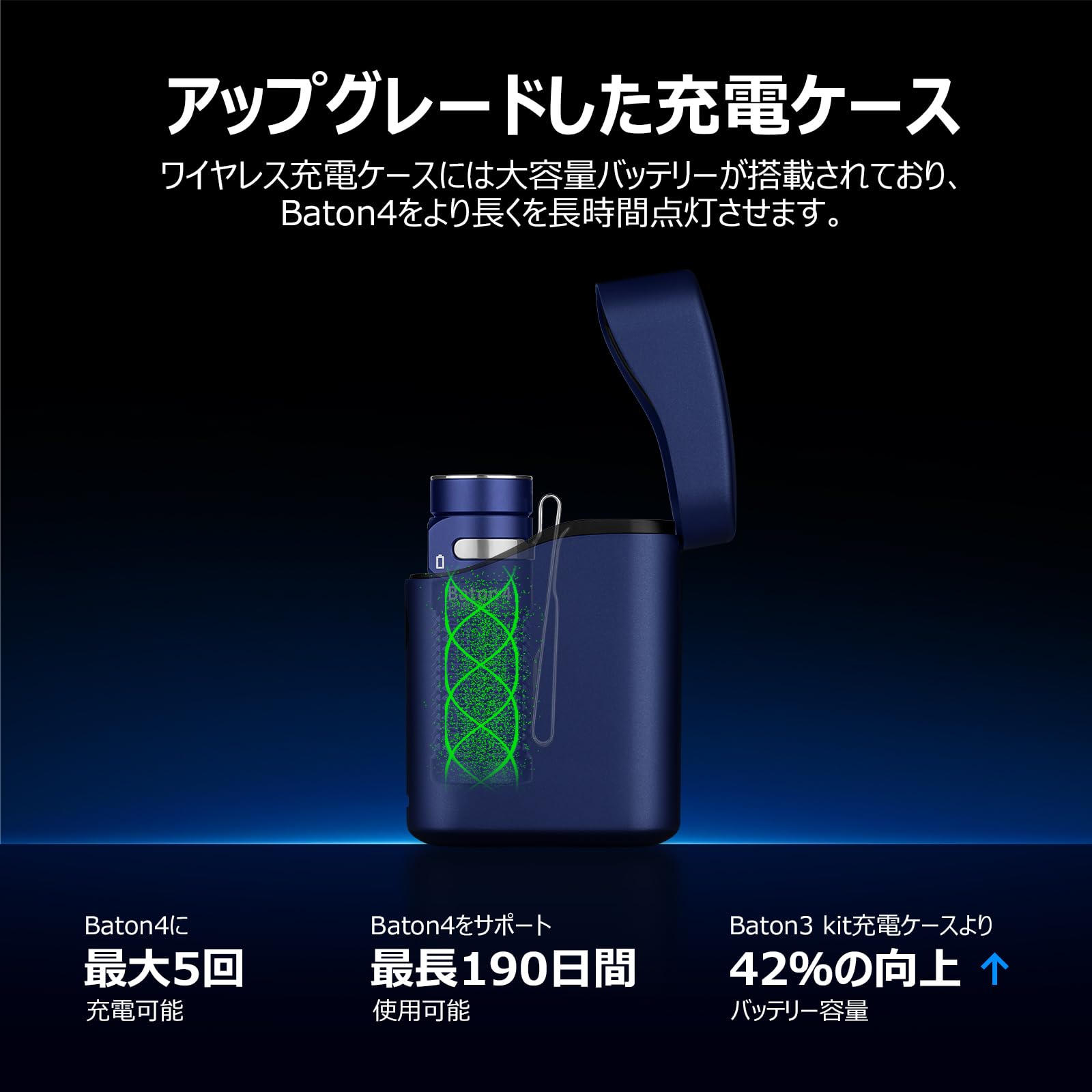 {ケースにも点灯可能} 充電ケースにBaton 4の収納、充電、無段階調光などの機能も実現しています。Baton 4は充電ケースの電源インジケータを押すことで、充電ケースから取り出すことなく充電ケースに入れたままでも点灯操作が可能です。ケースの蓋を閉じると、本体が自動的にオフになります。Baton 4の底面はマグネットで充電ケースに固定されているため、充電ケースから落ちることはありません(この機能はBaton 4とBaton 3に適していますが、S1RII/Perun mini/Perun 2 miniではケースのボタンを押して制御することはできません)