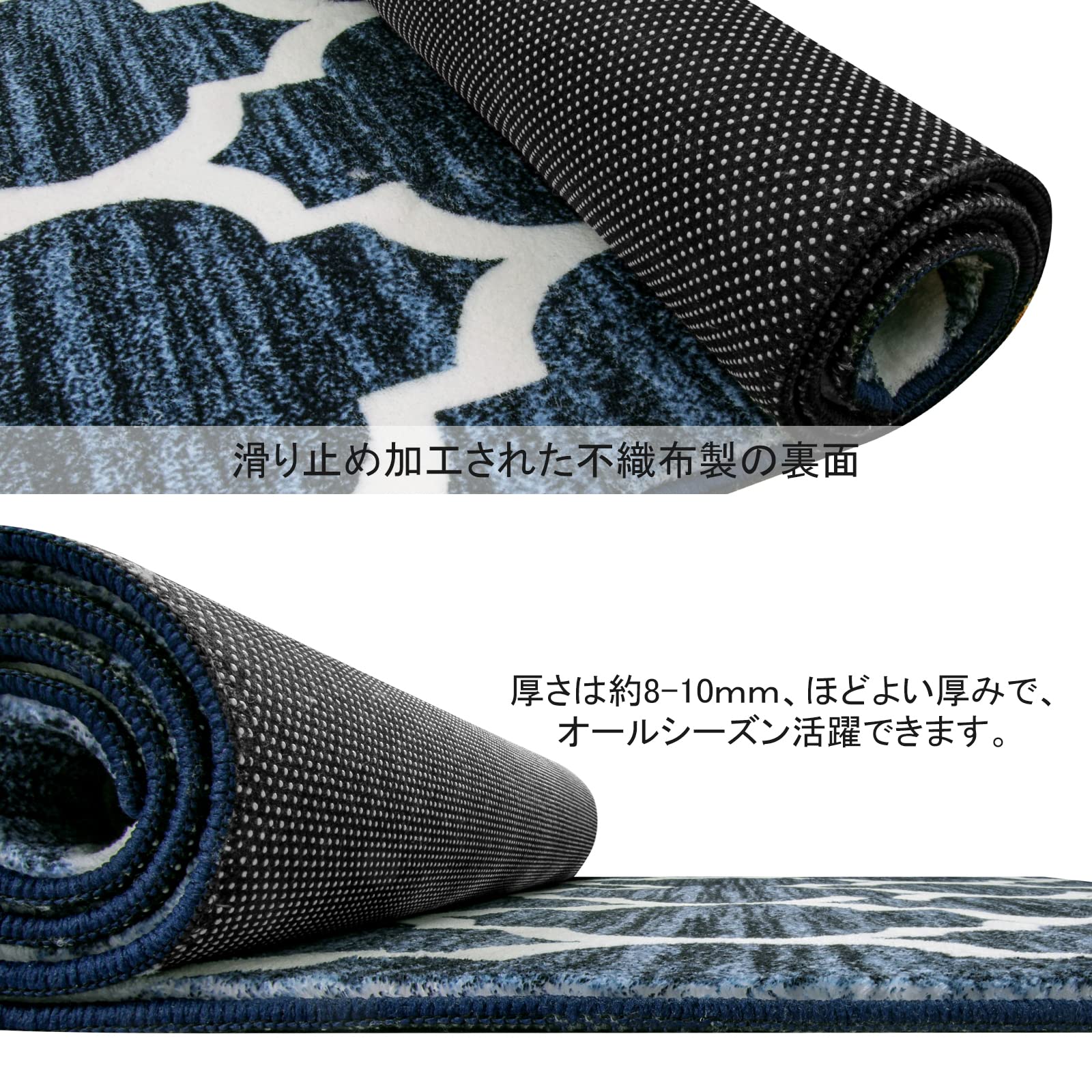 【特徴】不織布製の裏面には滑り止め加工を施しておりので、子供やペットがいらっしゃるご家庭でも安心してご使用いただけいます。ウール質感の表面は吸水・防音・防ダニ・抗菌・防臭の特徴があります。ふんわり柔らかく、沈みこむような心地良い質感。ほどよいな厚さで、1年中使えます。