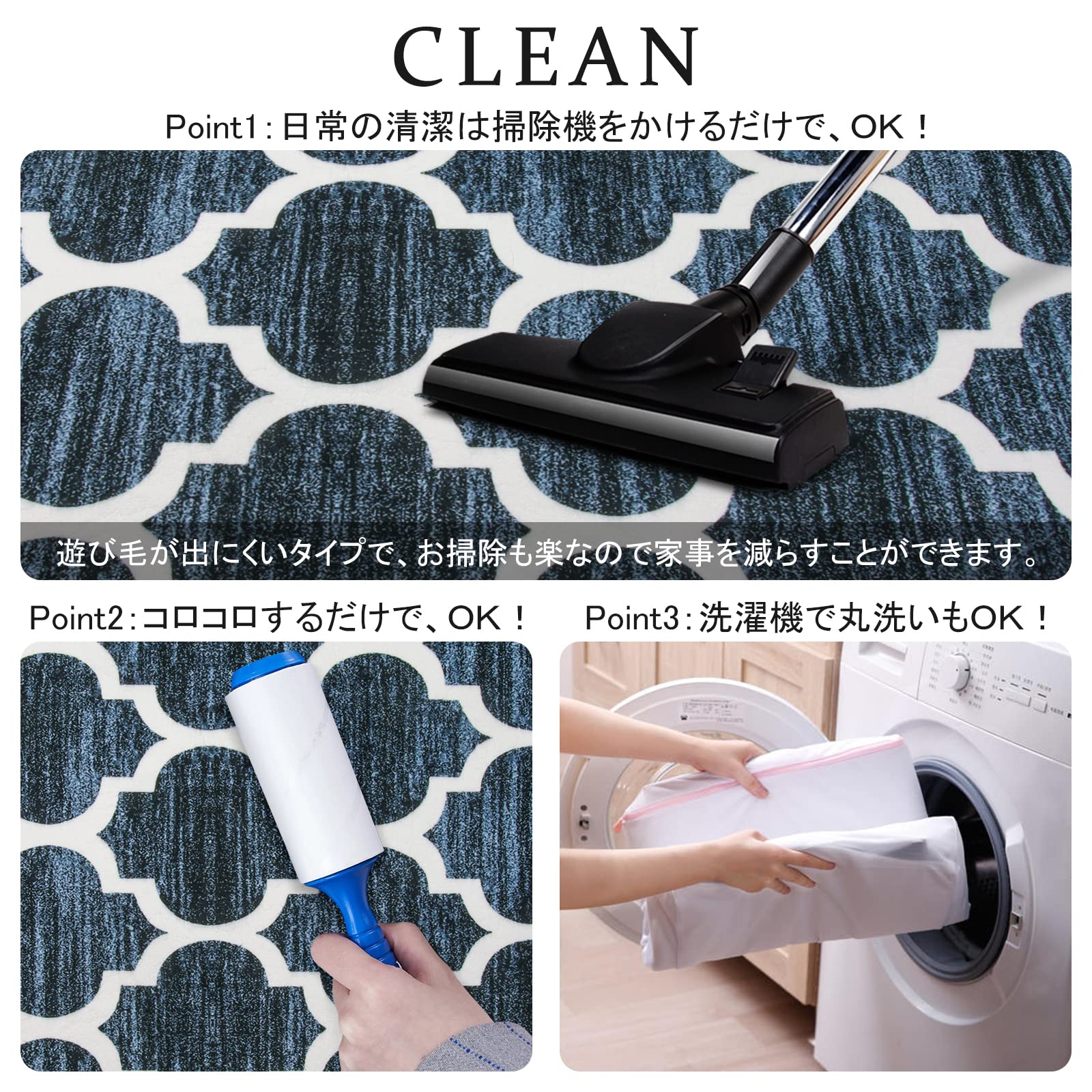 【洗濯機で洗える】毛足がないので、ゴミが絡みにくく、日常の清潔は粘着クリーナーをコロコロするや掃除機をかけるだけで、OK!屋外泥落とし用で汚れた場合は手洗いや洗濯ネットに入れて洗濯機で洗うことができます。※ラグは風通しの良いところで陰干しして、アイロン、乾燥機はご使用をお避け下さい。