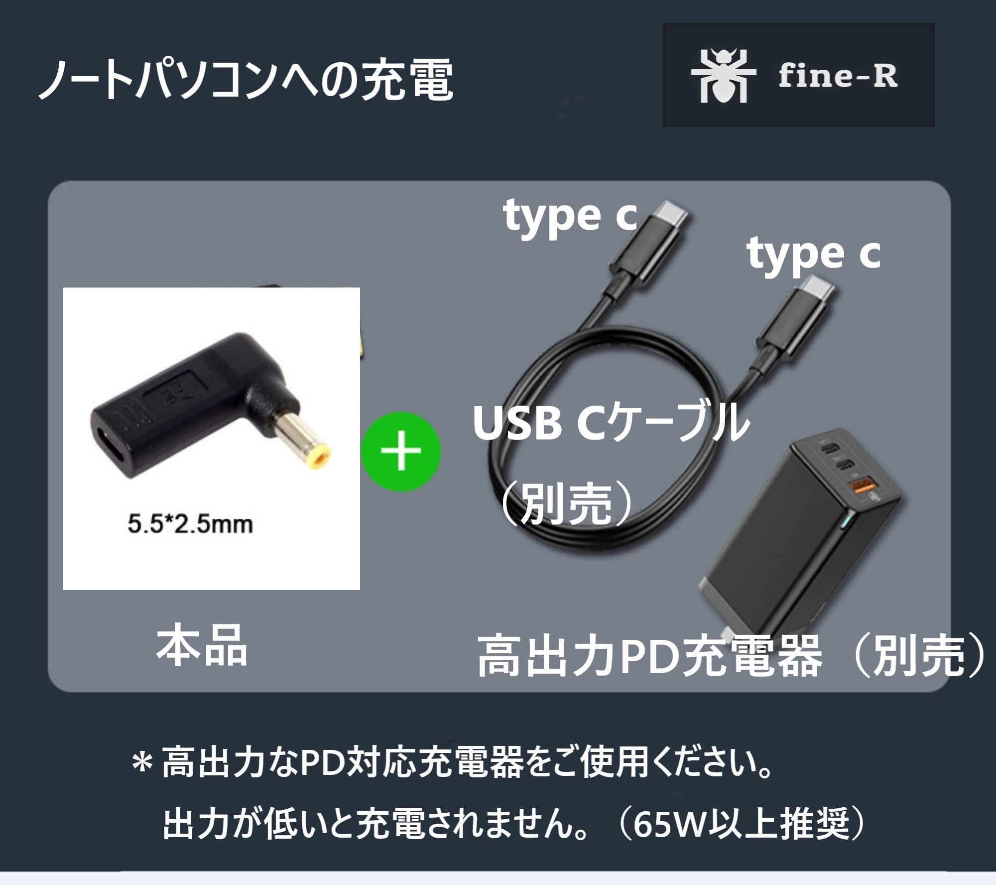 fine-R タイプC USB-C 入力 DC 5.5×2.5mm (他サイズあり) 変換 acer 東芝 ASUS Lenovo用 ノートパソコン 充電 PD 充電 日本検品済 TYPE-C 変換アダプター プラグ AC 充電 (PL保険加入品) (P 5525)