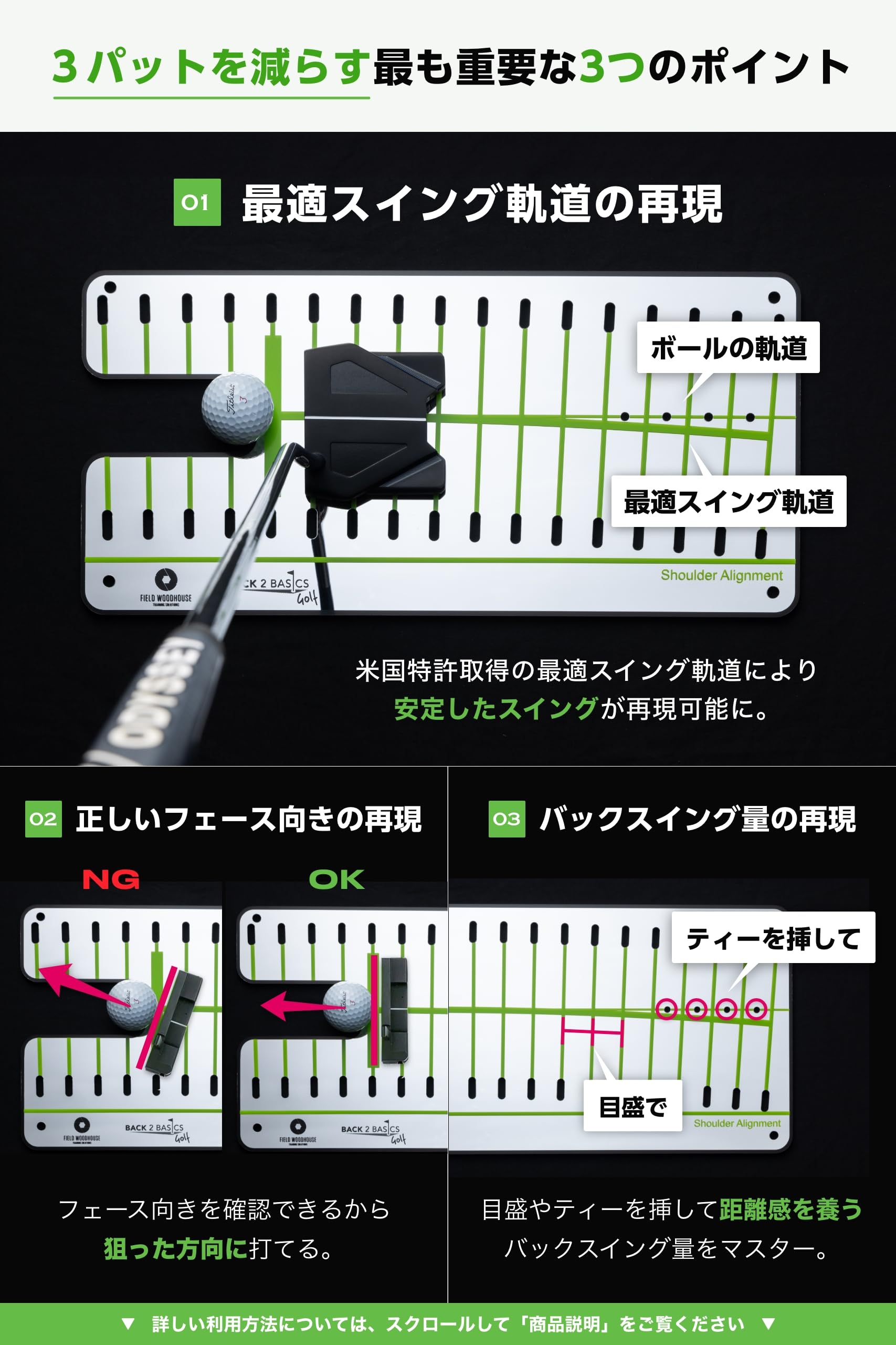 【 1日たった5分でも入るパターが身に付く 】ご自宅のパターマットの上に置いて、パターグリーンで、ラウンド前のアドレス確認に。重要ポイントが全て入っているからいつでもどこでも効率的なパター練習が可能。【 レ ベ ル を 問 わ ず 】 パターを上達させたい初級者やジュニアから、一打で人生が変わる世界のトッププレーヤーまで、世界中のスコアアップを目指したいゴルファーに選ばれています。