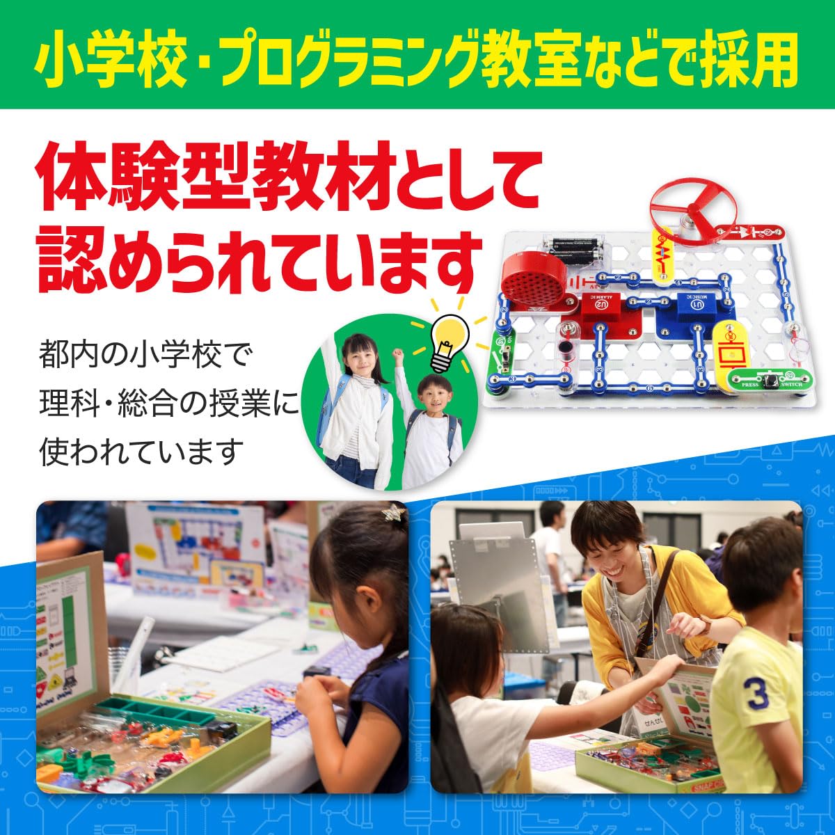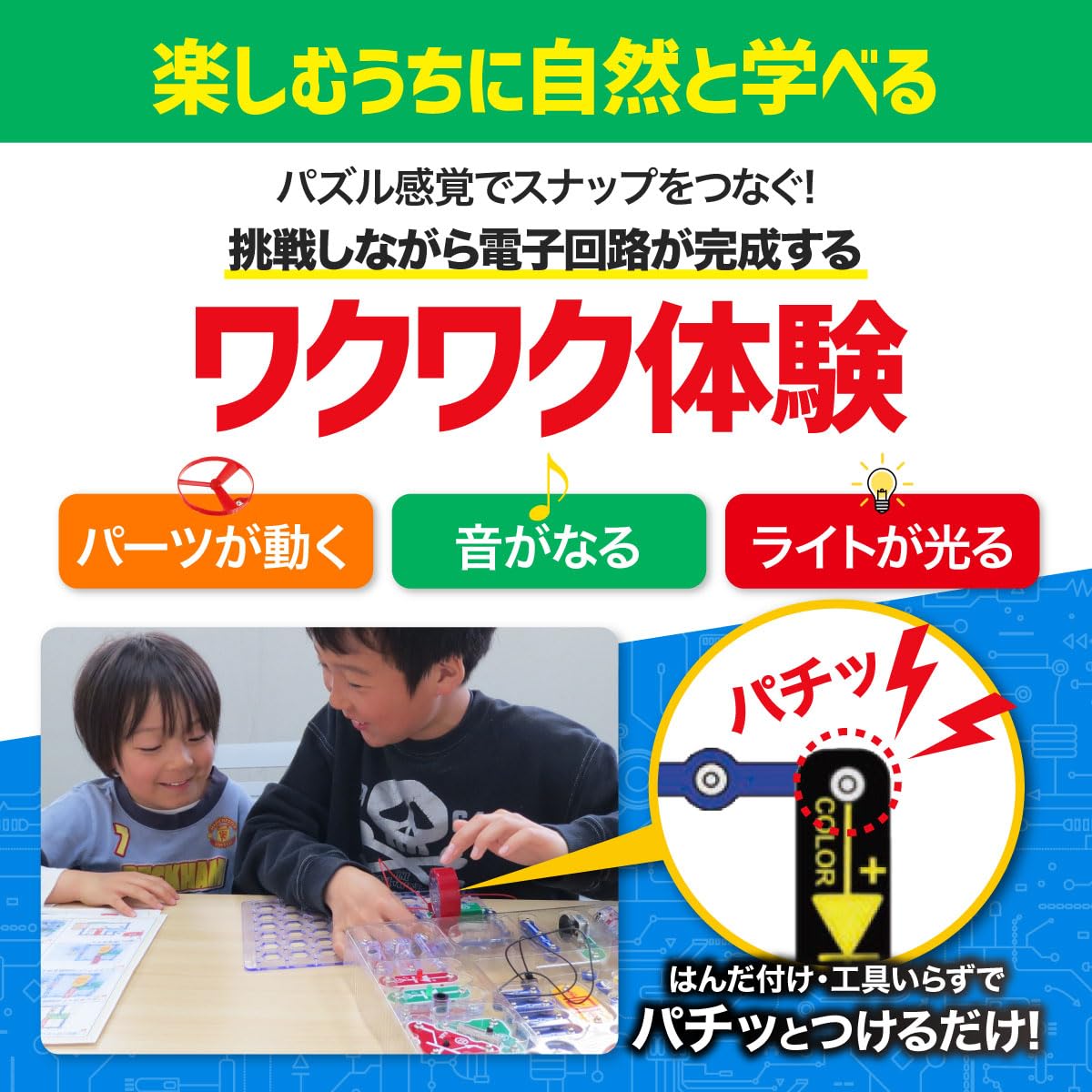 【難しいハンダ付け不要】パーツをスナップで止めながらつなげば電子回路が完成。お子さまだけでも安全に実験ができます。
