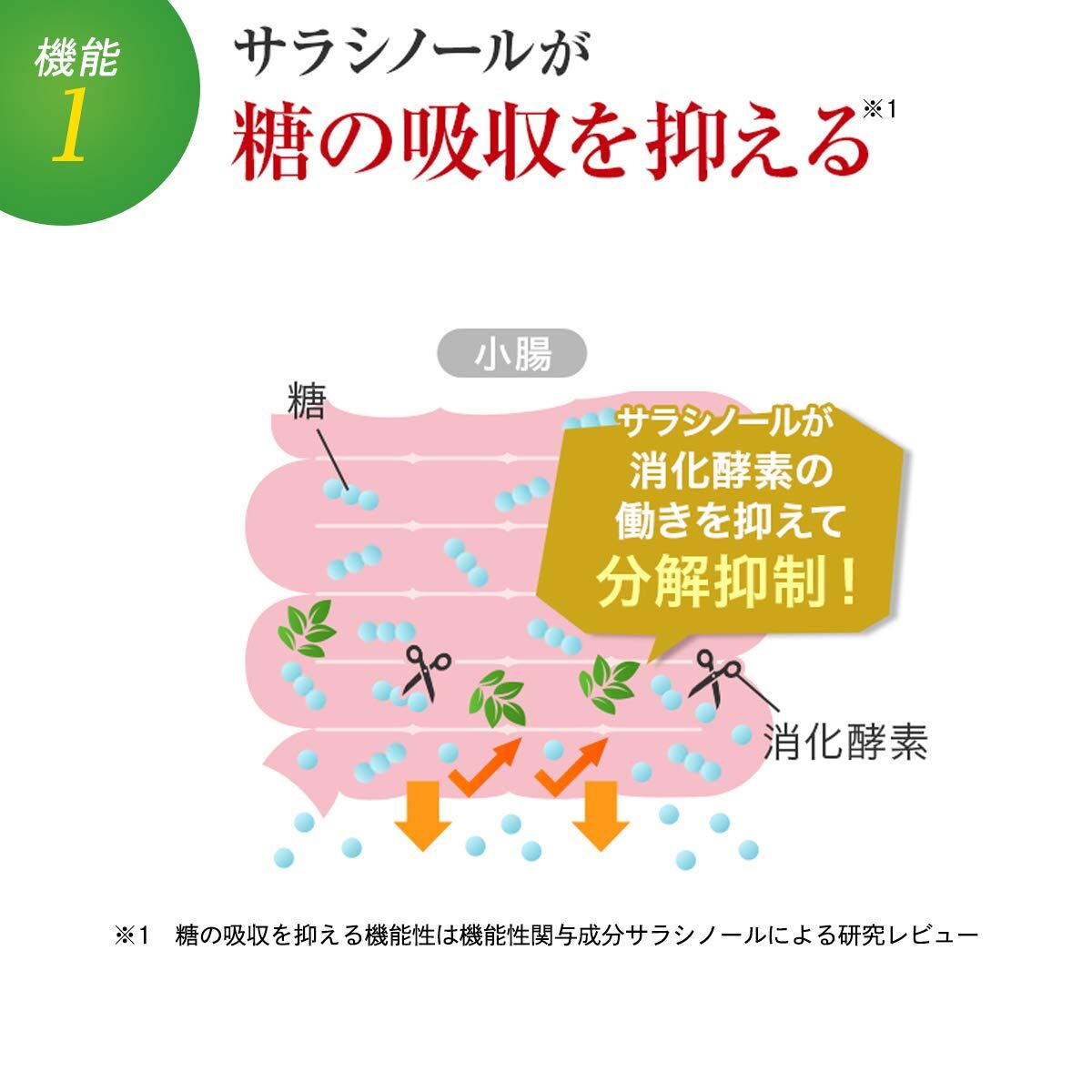 【注釈】※1: 糖の吸収を抑える機能性は機能性関与成分サラシノールによる研究レビュー ※2: 継続摂取により腸内環境を整える(おなかの中のビフィズス菌を増やす)機能性は機能性関与成分サラシノールによる研究レビュー ※3: 脂肪の吸収を抑える機能は最終製品を用いた臨床試験 ※4: 継続摂取によりBMIが高めな方のおなかの脂肪(体脂肪・内臓脂肪・皮下脂肪)・体重・ウエスト周囲径を減らすことで高めのBMIを低下させる機能は、最終製品を用いた臨床試験