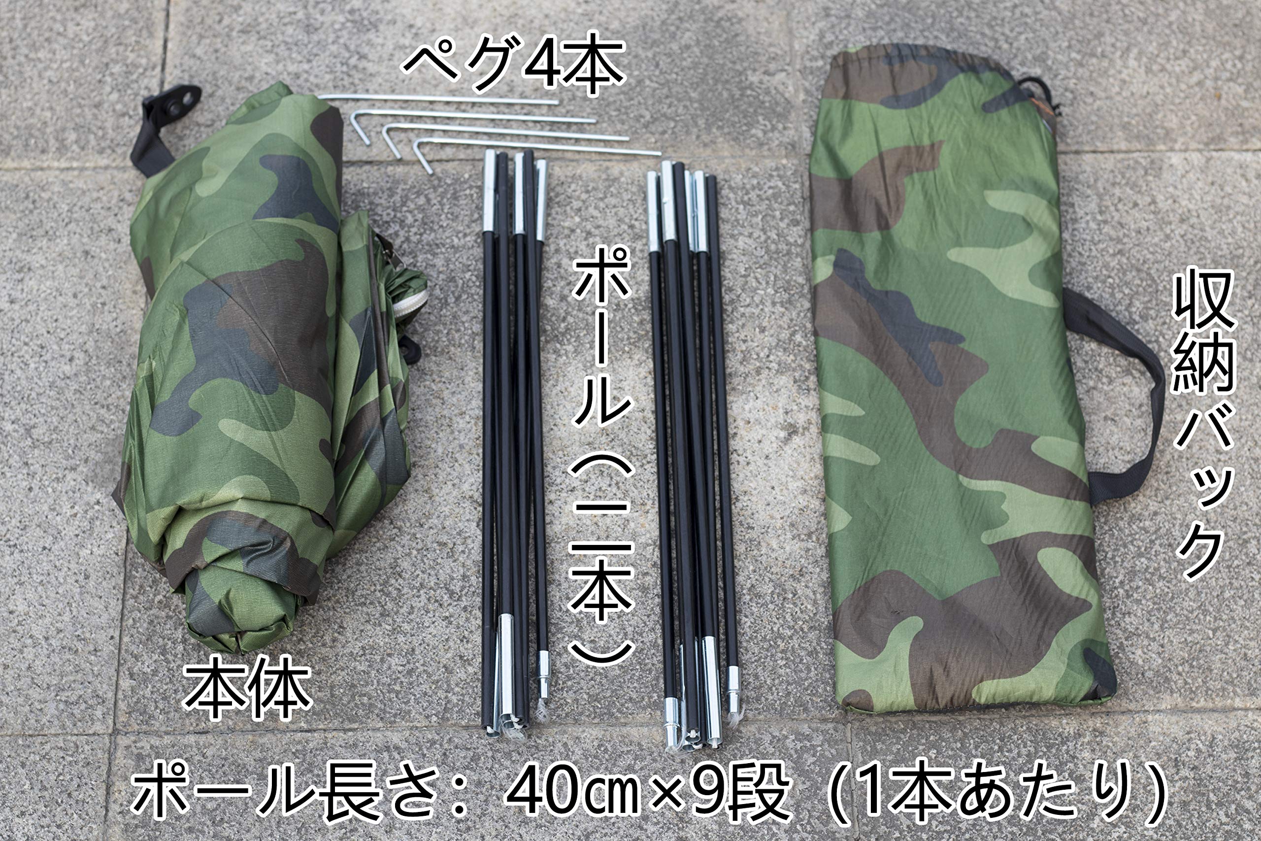 【コスパ抜群】テント本体+ポール2本+ペグ4本+収納袋の完全装備セット。カモフラージュ柄で自然に溶け込むデザインと、アウトドア初心者に最適なコストパフォーマンスを実現。