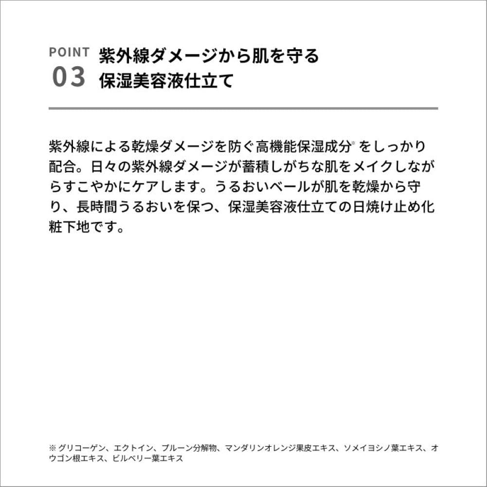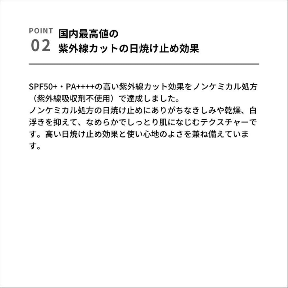 ・POINT01:毛穴レスなツヤ美肌が叶う補正化粧下地 ・POINT02:国内最高値の紫外線カットの日焼け止め効果(SPF50+・PA++++) ・POINT03:紫外線ダメージから肌を守る保湿美容液仕立て ・POINT04:パッチテスト・ノンコメドジェニックテスト済み、肌にやさしく石けんオフ可能