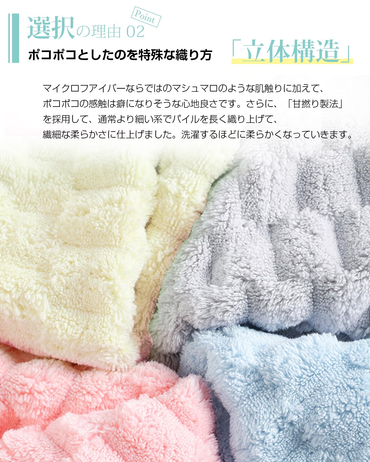 「飽きずに使える立体ポコポコのデザイン」シンプルなバスタオルがいいけど無地のバスタオルはちょっと物足りません。特殊な織りをエ夫してパイルがポコポコの立体構造になっています。ポコポコと浮き上がった柄がさりげなく可愛いです。さらに、「甘撚り製法」を採用して、通常より細い系でパイルを長く織り上げ、纎細な柔らかさに仕上げました。シルクのような独特の光沢感としなやかさがあります。