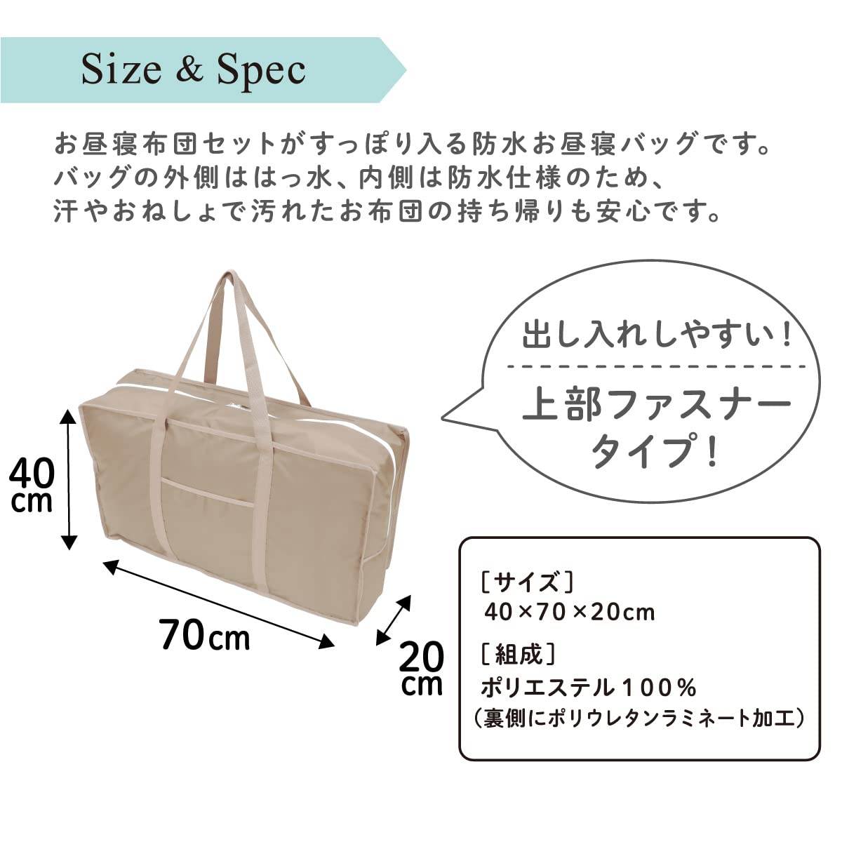 【上部ファスナー式】お昼寝布団セットがすっぽりと入ります。さらにハンカチ等の小物を入れることができる両面ポケット付き。