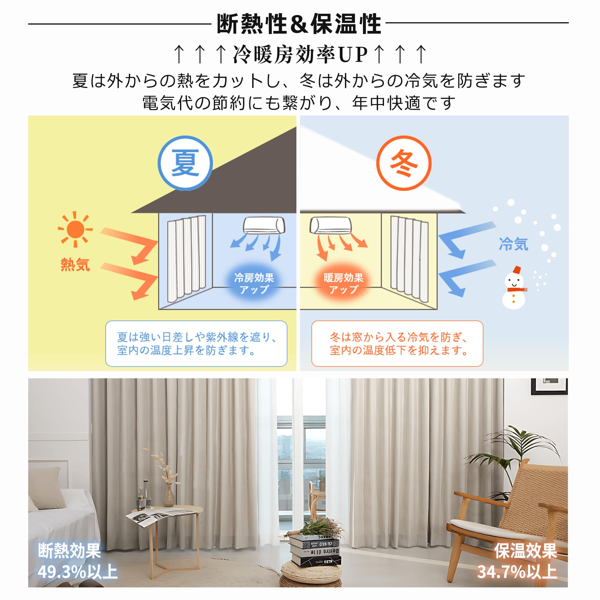 断熱と保温効果:断熱効果率49.3%以上、保温効果率34.7%以上。夏季には外の熱気を効果的に遮断し、室内を涼しく保つことでエアコンの効率を向上させます。冬季には外からの冷気を防ぎ、暖房の温かさを逃がさず、暖房効率を高めます。このカーテンは四季を通じてご使用いただけ、家族やペットに快適な生活環境を提供します