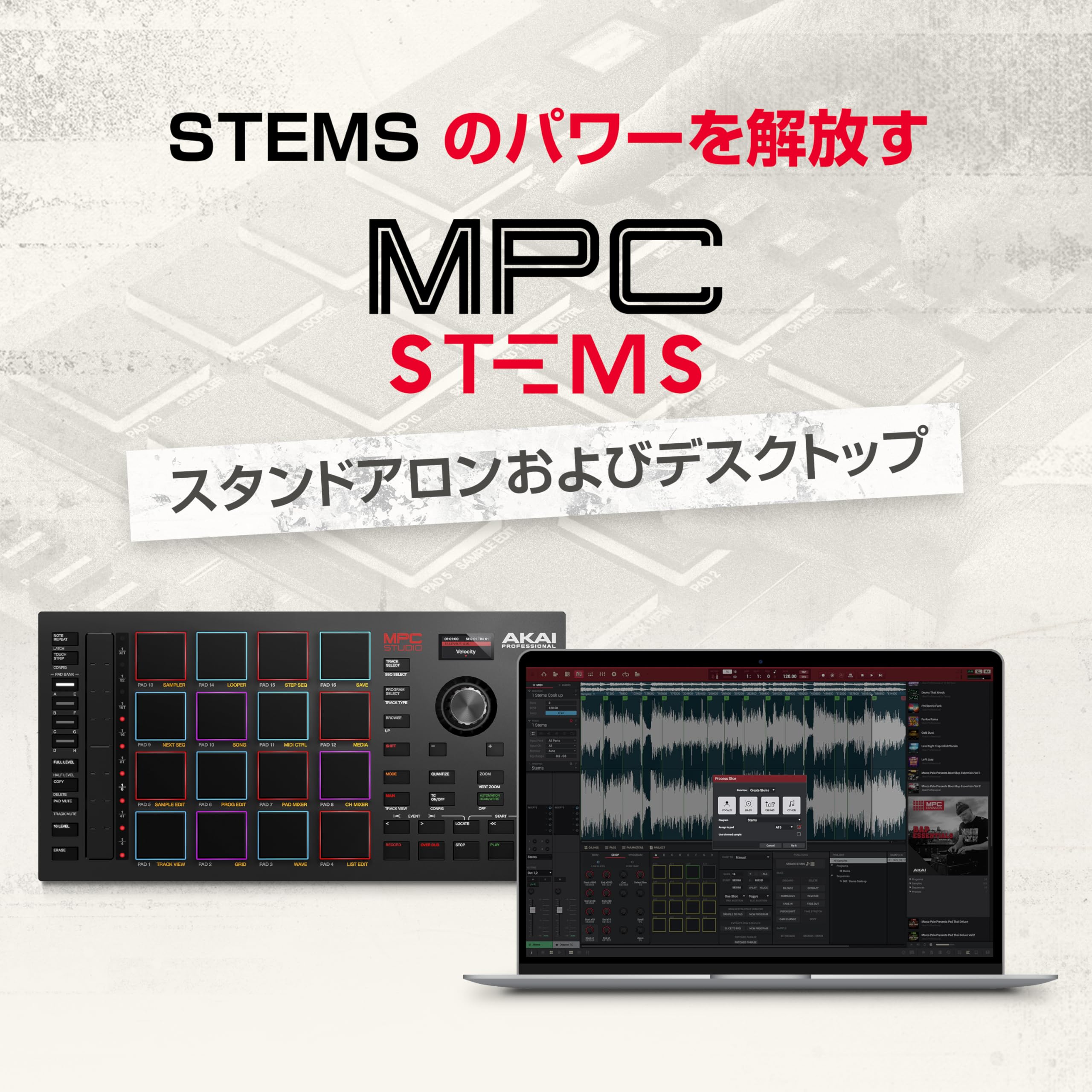 【MPC StemsがMPCスタンドアロンおよびMPC2 Desktopに対応】プロデューサーやビートメイカーにとって待望の画期的なステム分離機能により、どんなレコーディングやサンプルからでもドラム、ベース、バッキング、そしてボーカルを簡単に抽出し、まったく新しい楽曲を構築できます。
