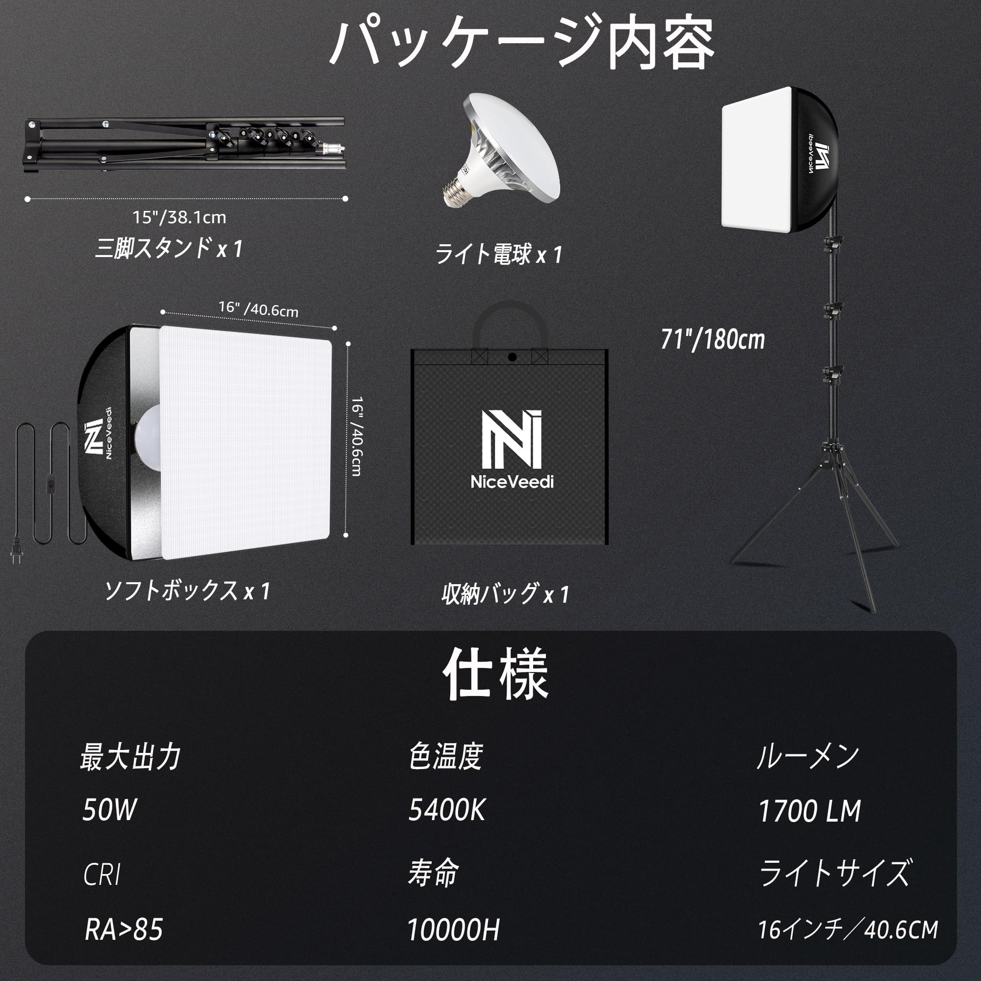 【パッケージリストとアフターサービス】このソフトボックス照明キットには、ソフトボックス×1、LED電球×1、三脚×1、取扱説明書×1、収納バッグ×1が含まれています。