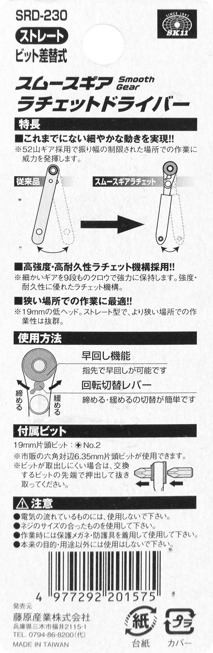 SK11(エスケー11) スムースに動く ラチェットドライバー ストレート型 ギア数52山 SRD-230